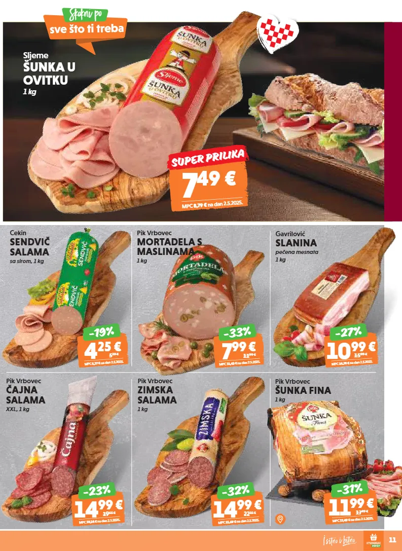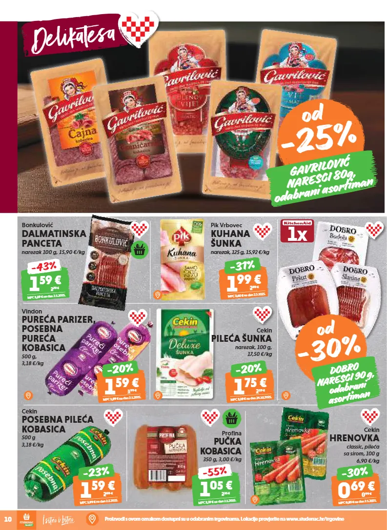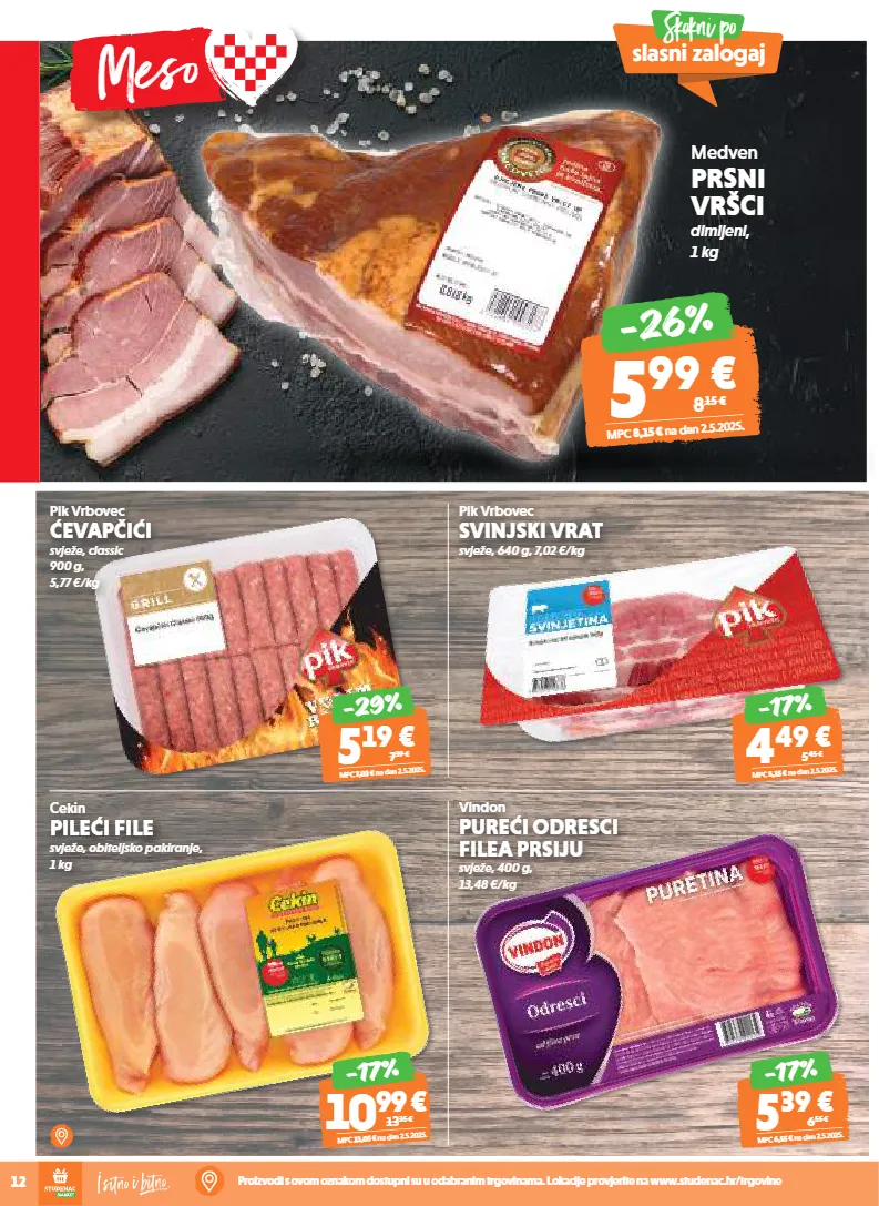 od srijede 26.11. do utorka 2. 12. 2025. Preuzmite MOJ STUDENAC karticu ili aplikaciju i kupujte povoljnije! SKENIRAJ ILI KLIKNI Svaki tjedan ostvari EKSTRA UŠTEDU od 20 % na ukupni iznos kupovine! niže cijene Pik Vrbovec MLJEVENO MIJEŠANO MESO svježe 850 g, 6,93 €/kg Bonkulović ŠUNKA SUHA DALMATINSKA 1 kg 11 99 € MPC 19,03 € na dan 2.5.2025. 19 03 € -36% 5 89 € MPC 6,96 € na dan 2.5.2025. 7 10 € -17%
