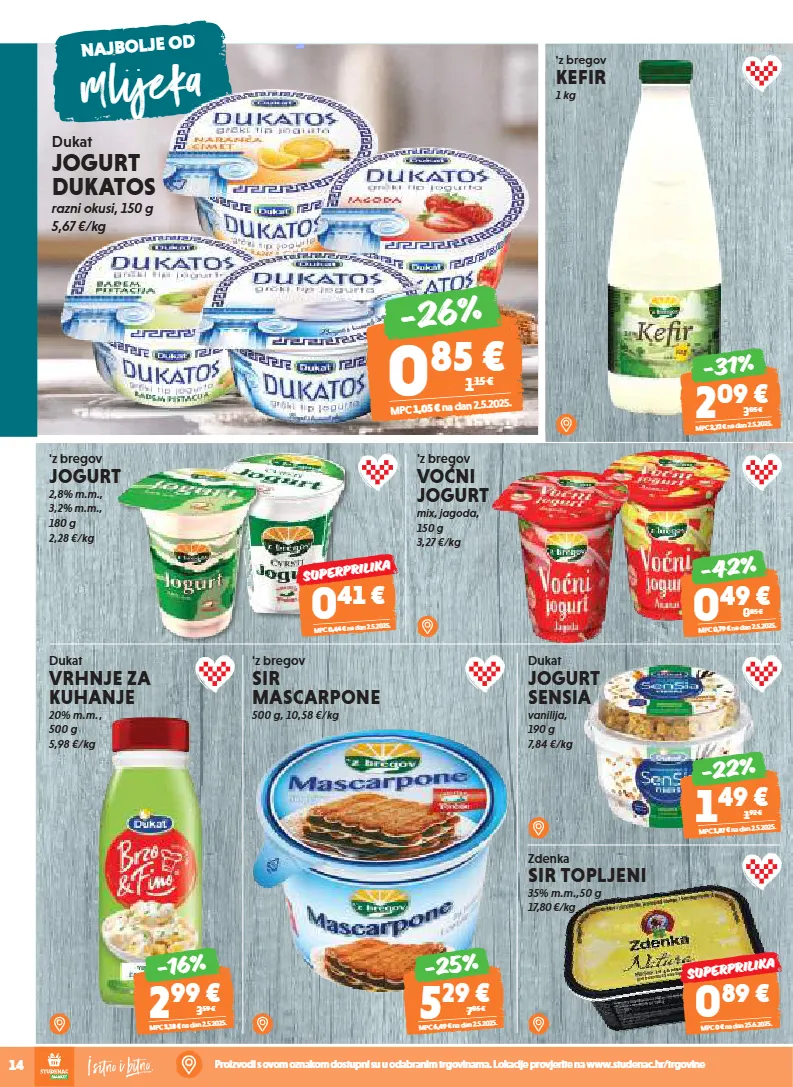 23 3,2% m.m. mlijeka najbolje od 23 3,2% m.m. 'z bregov jogurt 2,8% m.m., 3,2% m.m., 180 g 2,28 €/kg 'z bregov voćni jogurt mix, jagoda, 150 g 3,27 €/kg zdenka sir topljeni 35% m.m.,50 g 17,80 €/kg dukat jogurt sensia vanilija, 190 g 7,84 €/kg dukat jogurt dukatos razni okusi, 150 g 5,67 €/kg -31% 2 09 € mpc 2,72 € na dan 2.5.2025. 3 05 € -42% 0 49 € mpc 0,79 € na dan 2.5.2025. 0 85 € -22% 1 49 € mpc 1,87 € na dan 2.5.2025. 1 92 € -26% 0 85 € mpc 1,05 € na dan 2.5.2025. 1 15 € -25% 5 29 € mpc 6,49 € na dan 2.5.2025. 7 05 € -16% 2 99 € mpc 3,18 € na dan 2.5.2025. 3 59 € 0 41 € mpc 0,44 € na dan 2.5.2025. superprilika 0 89 € mpc 0 € na dan 25.6.2025. superprilika 'z bregov kefir 1 kg 'z bregov sir mascarpone 500 g, 10,58 €/kg dukat vrhnje za kuhanje 20% m.m. , 500 g 5,98 €/kg 14 proizvodi s ovom oznakom dostupni su u odabranim trgovinama. lokacije provjerite na www.studenac.hr/trgovine
