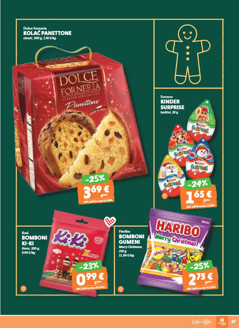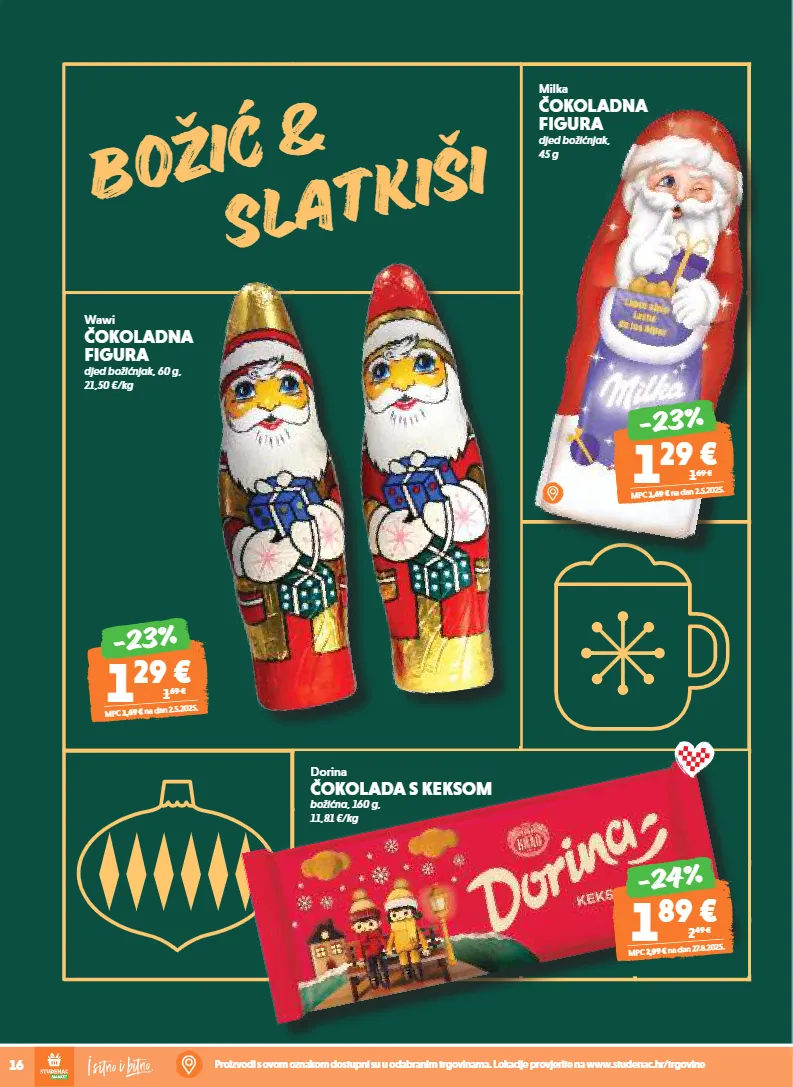16 Proizvodi s ovom oznakom dostupni su u odabranim trgovinama. Lokacije provjerite na www.studenac.hr/trgovine Milka ČOKOLADNA FIGURA djed božićnjak, 45 g -23% 1 29 € MPC 1,69 € na dan 2.5.2025. 1 69 € Dorina ČOKOLADA S KEKSOM božićna, 160 g, 11,81 €/kg -24% 1 89 € MPC 2,99 € na dan 27.8.2025. 2 49 € Wawi ČOKOLADNA FIGURA djed božićnjak, 60 g, 21,50 €/kg -23% 1 29 € MPC 1,69 € na dan 2.5.2025. 1 69 € BOŽIĆ & SLATKIŠI