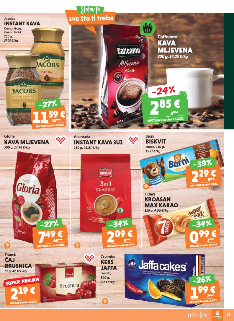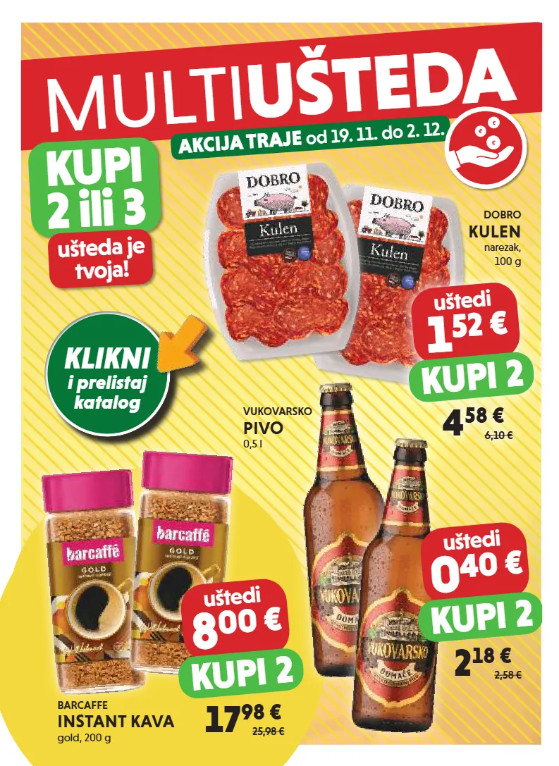 multi ušteda akcija traje od 19. 11. do 2. 12. € € € klikni i prelistaj katalog kupi 2 ili 3 ušteda je tvoja! dobro kulen narezak, 100 g barcaffe instant kava gold, 200 g 2,58 € 2 18 € uštedi 0 40 € kupi 2 25,98 € 17 98 € uštedi 8 00 € kupi 2 6,10 € 4 58 € uštedi 1 52 € kupi 2 vukovarsko pivo 0,5 l