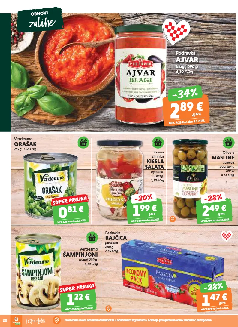1 22 € mpc 1,95 € na dan 2.5.2025. super prilika 0 81 € mpc 1,36 € na dan 2.5.2025. super prilika verdeamo šampinjoni rezani, 200 g, 6,10 €/kg podravka ajvar blagi, 690 g 4,19 €/kg podravka rajčica pasirana, 600 g 2,45 €/kg -20% 1 99 € mpc 2,49 € na dan 2.5.2025. 2 49 € -28% 2 49 € mpc 3,49 € na dan 2.5.2025. 3 49 € verdeamo grašak 265 g, 3,06 €/kg zalihe obnovi 20 proizvodi s ovom oznakom dostupni su u odabranim trgovinama. lokacije provjerite na www.studenac.hr/trgovine -28% 1 47 € mpc 2,07 € na dan 2.5.2025. 2 07 € bakina zimnica kisela salata mješana, 390 g, 5,10 €/kg oliveta masline zelene s paprikom, 380 g, 6,55 €/kg -34% 2 89 € mpc 4,23 € na dan 2.5.2025. 4 39 €