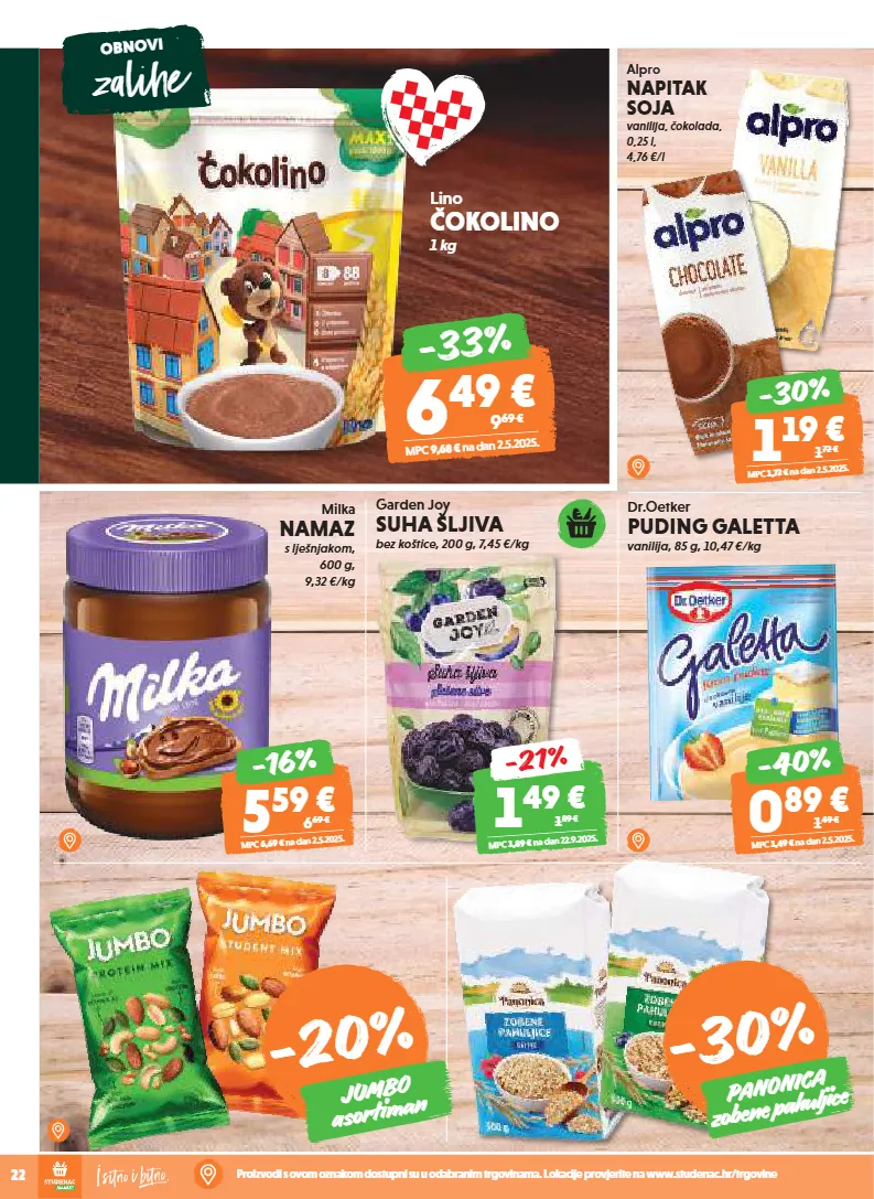lino čokolino 1 kg garden joy suha šljiva bez koštice, 200 g, 7,45 €/kg -21% 1 49 € mpc 1,89 € na dan 22.9.2025. 1 89 € -33% 6 49 € mpc 9,68 € na dan 2.5.2025. 9 69 € -16% 5 59 € mpc 6,69 € na dan 2.5.2025. 6 69 € -40% 0 89 € mpc 1,49 € na dan 2.5.2025. 1 49 € dr.oetker puding galetta vanilija, 85 g, 10,47 €/kg milka namaz s lješnjakom, 600 g, 9,32 €/kg -30% 1 19 € mpc 1,72 € na dan 2.5.2025. 1 72 € proizvodi s ovom oznakom dostupni su u odabranim trgovinama. lokacije provjerite na www.studenac.hr/trgovine zalihe obnovi 22 proizvodi s ovom oznakom dostupni su u odabranim trgovinama. lokacije provjerite na www.studenac.hr/trgovine alpro napitak soja vanilija, čokolada, 0,25 l, 4,76 €/l -20% jumbo asortiman -30% panonica zobene pahuljice