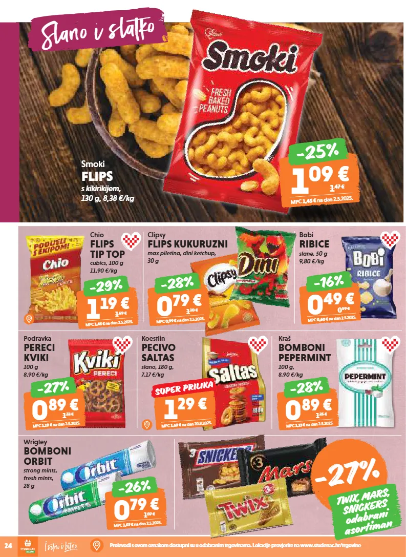 24 proizvodi s ovom oznakom dostupni su u odabranim trgovinama. lokacije provjerite na www.studenac.hr/trgovine wrigley bomboni orbit strong mints, fresh mints, 28 g smoki flips s kikirikijem, 130 g, 8,38 €/kg -25% 1 09 € mpc 1,45 € na dan 2.5.2025. 1 47 € -29% 1 19 € mpc 1,65 € na dan 2.5.2025. 1 69 € -27% 0 89 € mpc 1,19 € na dan 2.5.2025. 1 22 € -28% 0 89 € mpc 1,23 € na dan 2.5.2025. 1 25 € -28% 0 79 € mpc 0,99 € na dan 2.5.2025. 1 10 € -16% 0 49 € mpc 0,60 € na dan 2.5.2025. 0 59 € chio flips tip top cubics, 100 g 11,90 €/kg podravka pereci kviki 100 g 8,90 €/kg koestlin pecivo saltas slano, 180 g, 7,17 €/kg kraš bomboni pepermint 100 g, 8,90 €/kg bobi ribice slane, 50 g 9,80 €/kg -26% 0 79 € mpc 1,07 € na dan 2.5.2025. 1 07 € clipsy flips kukuruzni max piletina, dini ketchup, 30 g 1 29 € mpc 1,69 € na dan 20.8.2025. super prilika slano i slatko -27% twix, mars, snickers odabrani asortiman
