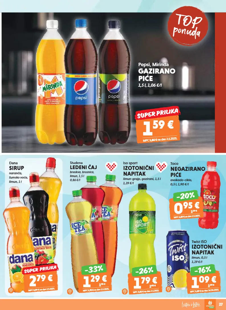 27 2 79 € mpc 2,99 € na dan 2.5.2025. super prilika top top ponuda dana sirup naranča, šumsko voće, limun, 1 l -26% 1 79 € mpc 2,32 € na dan 2.5.2025. 2 45 € -16% 1 09 € mpc 1,29 € na dan 14.10.2025. 1 29 € iso sport izotonični napitak limun-grejp, gazirani, 1,5 l 1,19 €/l toco negazirano piće avokado-cikla, 0,5 l, 1,90 €/l twist iso izotonični napitak limun, 0,5 l 1,19 €/l pepsi, mirinda gazirano piće 1,5 l, 1,06 €/l -20% 0 95 € mpc 1,07 € na dan 2.5.2025. 1 19 € 1 59 € mpc 1,86 € na dan 2.5.2025. super prilika studena ledeni čaj breskva, brusnica, limun, 1,5 l 0,86 €/l -33% 1 29 € mpc 1,75 € na dan 2.5.2025. 1 95 €