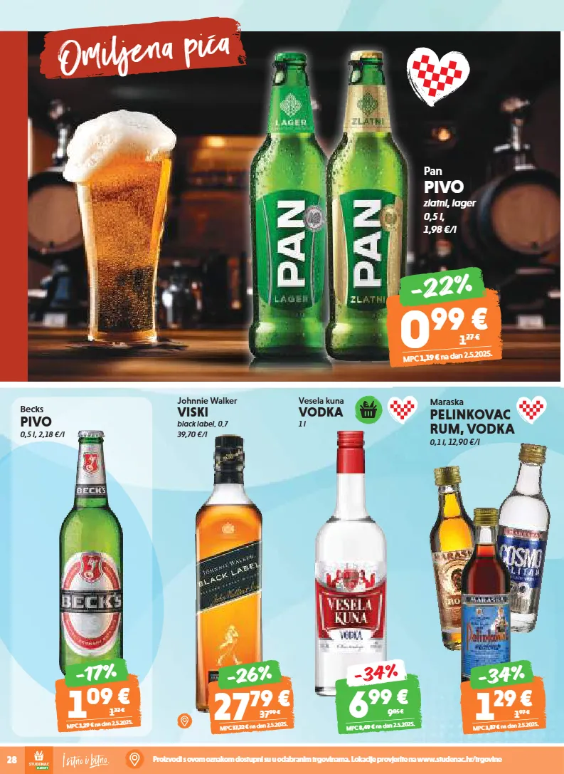 omiljena pića 28 proizvodi s ovom oznakom dostupni su u odabranim trgovinama. lokacije provjerite na www.studenac.hr/trgovine becks pivo 0,5 l, 2,18 €/l pan pivo zlatni, lager 0,5 l, 1,98 €/l -34% 1 29 € mpc 1,87 € na dan 2.5.2025. 1 97 € maraska pelinkovac rum, vodka 0,1 l, 12,90 €/l -22% 0 99 € mpc 1,19 € na dan 2.5.2025. 1 27 € -26% 27 79 € mpc 37,22 € na dan 2.5.2025. 37 99 € johnnie walker viski black label, 0,7 39,70 €/l vesela kuna vodka 1 l -17% 1 09 € mpc 1,29 € na dan 2.5.2025. 1 32 € -34% 6 99 € mpc 8,49 € na dan 2.5.2025. 9 05 €