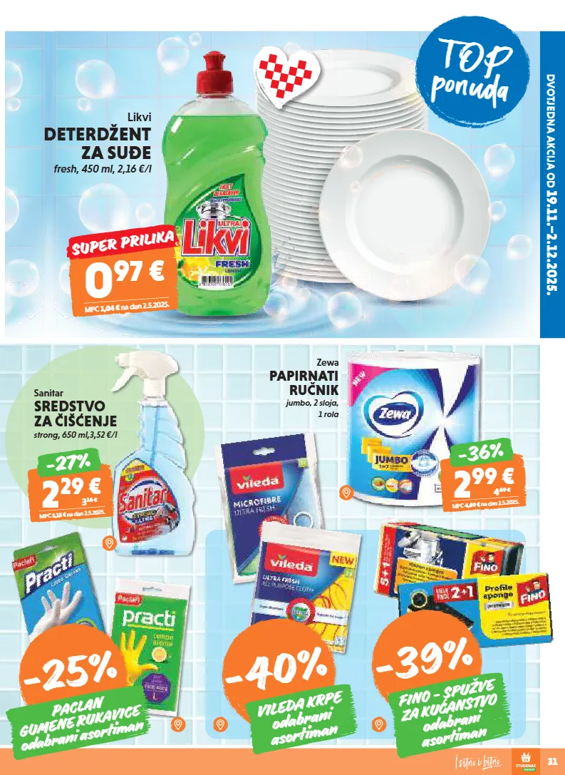 31 top top ponuda ponuda likvi deterdžent za suđe fresh, 450 ml, 2,16 €/l -27% 2 29 € mpc 3,15 € na dan 2.5.2025. 3 15 € sanitar sredstvo za čišćenje strong, 650 ml,3,52 €/l dvotjedna akcija od 19.11.–2.12.2025. 0 97 € mpc 1,04 € na dan 2.5.2025. super prilika -36% 2 99 € mpc 4,69 € na dan 2.5.2025. 4 69 € zewa papirnati ručnik jumbo, 2 sloja, 1 rola -40% vileda krpe odabrani asortiman -39% fino - spužve za kućanstvo odabrani asortiman -25% paclan gumene rukavice odabrani asortiman
