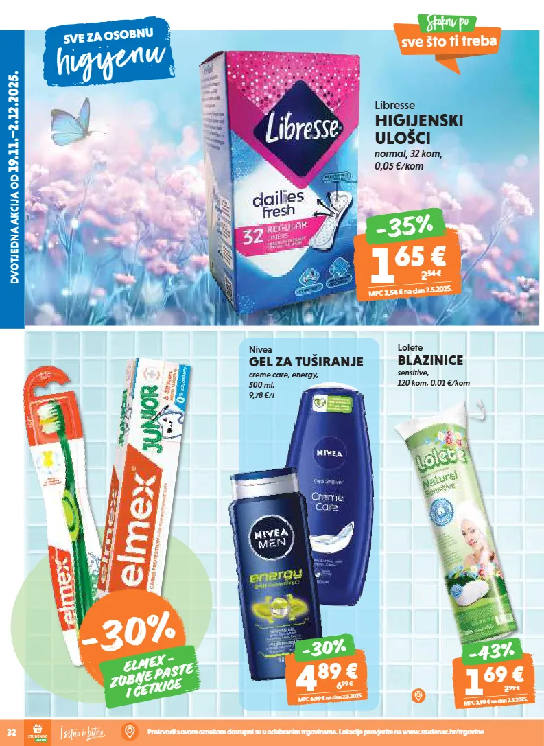 32 proizvodi s ovom oznakom dostupni su u odabranim trgovinama. lokacije provjerite na www.studenac.hr/trgovine higijenu sve za osobnu -35% 1 65 € mpc 2,54 € na dan 2.5.2025. 2 54 € libresse higijenski ulošci normal, 32 kom, 0,05 €/kom skokni po sve što ti treba nivea gel za tuširanje creme care, energy, 500 ml, 9,78 €/l -30% 4 89 € mpc 6,99 € na dan 2.5.2025. 6 99 € lolete blazinice sensitive, 120 kom, 0,01 €/kom dvotjedna akcija od 19.11.–2.12.2025. -30% elmex - zubne paste i četkice -43% 1 69 € mpc 2,99 € na dan 2.5.2025. 2 99 €