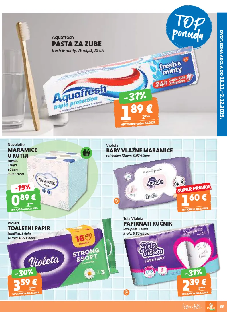 33 aquafresh pasta za zube fresh & minty, 75 ml,25,20 €/l top top ponuda ponuda violeta baby vlažne maramice soft lotion,72 kom, 0,02 €/kom 1 60 € mpc 2,33 € na dan 2.5.2025. super prilika nuvolette maramice u kutiji classic, 3 sloja 60 kom 0,01 €/kom -19% 0 89 € mpc 1,10 € na dan 2.5.2025. 1 10 € -31% 1 89 € mpc 2,60 € na dan 2.5.2025. 2 75 € dvotjedna akcija od 19.11.–2.12.2025. -31% 2 39 € mpc 3,87 € na dan 2.5.2025. 3 49 € teta violeta papirnati ručnik love print, 3 sloja, 3 role, 0,80 €/rola violeta toaletni papir kamilica, 3 sloja, 16 rola, 0,22 €/rola -30% 3 59 € mpc 5,69 € na dan 2.5.2025. 5 19 €