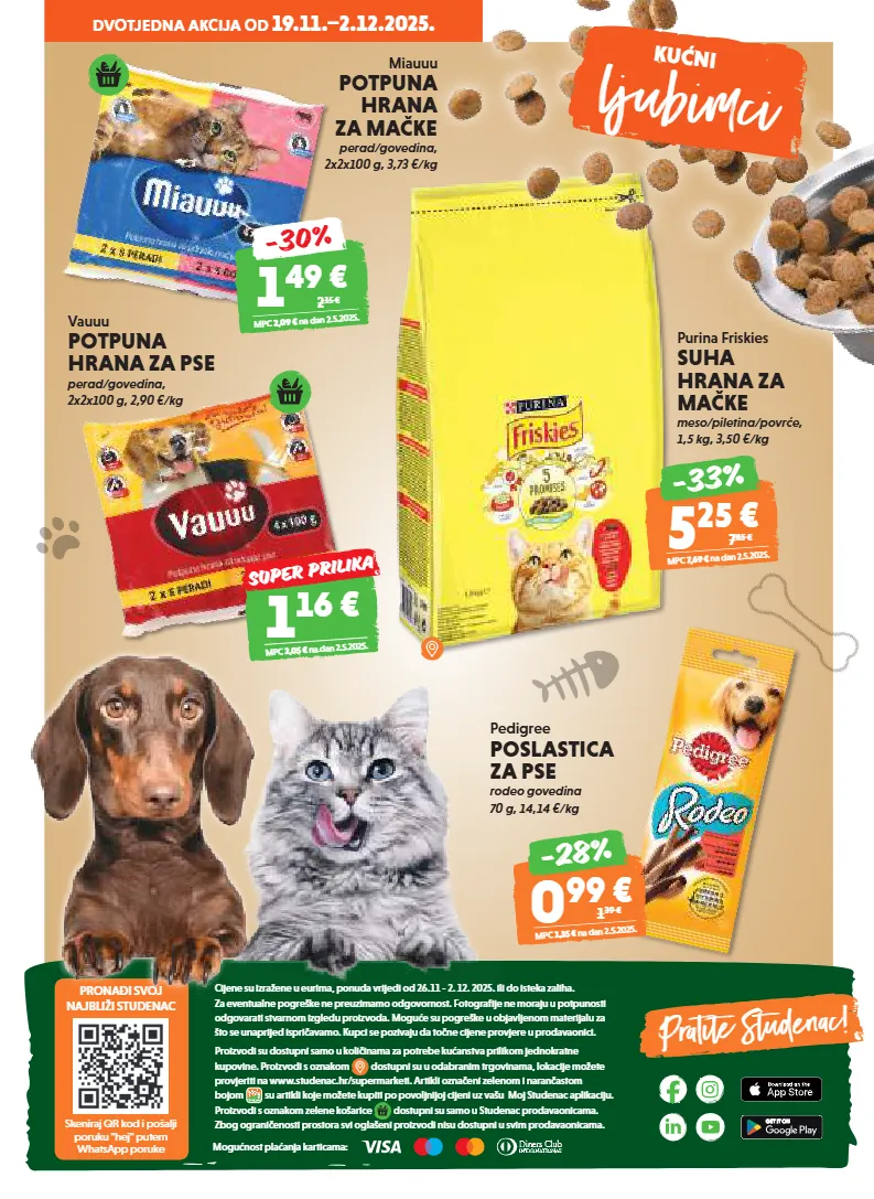pra t i t e s t udenac! mogućnost plaćanja karticama: pronađi svoj najbliži studenac skeniraj qr kod i pošalji poruku "hej" putem whatsapp poruke cijene su izražene u eurima, ponuda vrijedi od 26.11 - 2. 12. 2025. ili do isteka zaliha. za eventualne pogreške ne preuzimamo odgovornost. fotografije ne moraju u potpunosti odgovarati stvarnom izgledu proizvoda. moguće su pogreške u objavljenom materijalu za što se unaprijed ispričavamo. kupci se pozivaju da točne cijene provjere u prodavaonici. proizvodi su dostupni samo u količinama za potrebe kućanstva prilikom jednokratne kupovine. proizvodi s oznakom dostupni su u odabranim trgovinama, lokacije možete provjeriti na www.studenac.hr/supermarketi. artikli označeni zelenom i narančastom bojom su artikli koje možete kupiti po povoljnijoj cijeni uz vašu moj studenac aplikaciju. proizvodi s oznakom zelene košarice dostupni su samo u studenac prodavaonicama. zbog ograničenosti prostora svi oglašeni proizvodi nisu dostupni u svim prodavaonicama. -30% 1 49 € mpc 2,09 € na dan 2.5.2025. 2 15 € miauuu potpuna hrana za mačke perad/govedina, 2x2x100 g, 3,73 €/kg vauuu potpuna hrana za pse perad/govedina, 2x2x100 g, 2,90 €/kg purina friskies suha hrana za mačke meso/piletina/povrće, 1,5 kg, 3,50 €/kg -33% 5 25 € mpc 7,69 € na dan 2.5.2025. 7 85 € ljubimci kućni 1 16 € mpc 2,05 € na dan 2.5.2025. super prilika -28% 0 99 € mpc 1,35 € na dan 2.5.2025. 1 39 € pedigree poslastica za pse rodeo govedina 70 g, 14,14 €/kg dvotjedna akcija od 19.11.–2.12.2025.