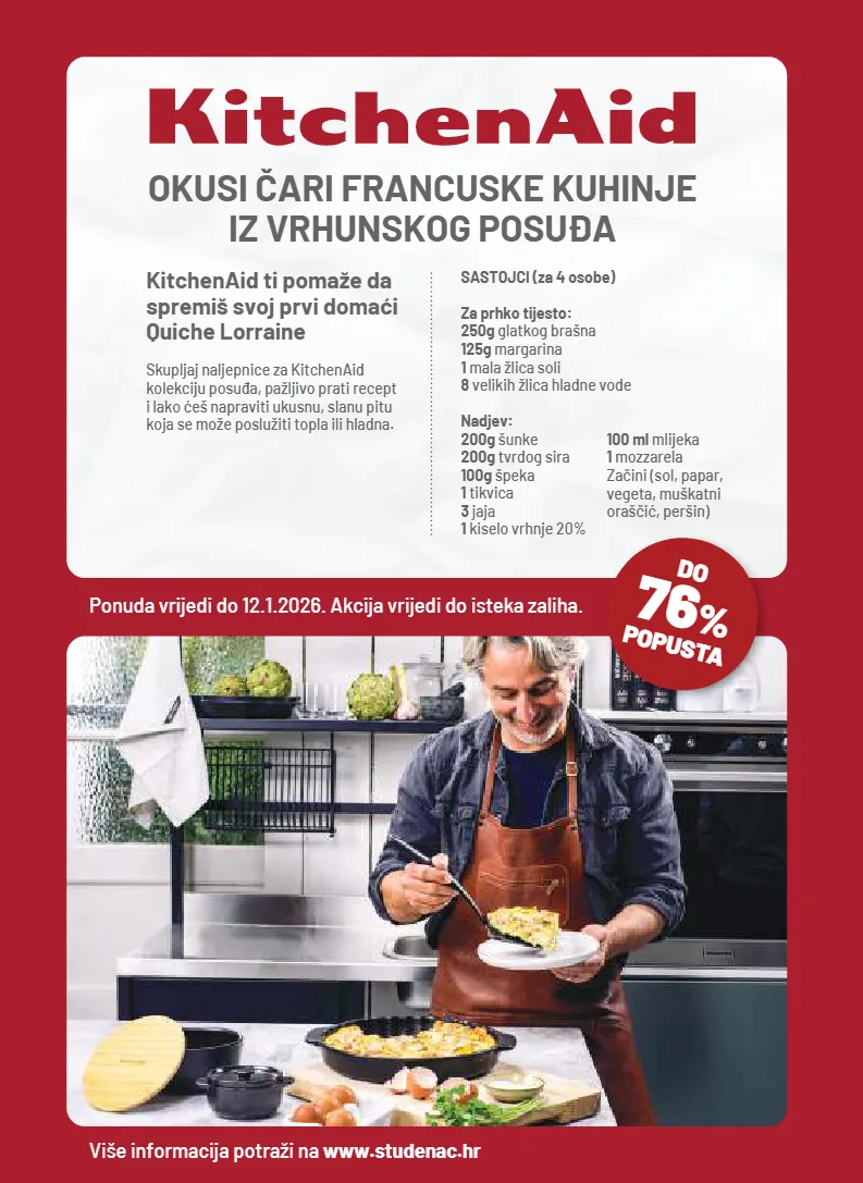 okusi čari francuske kuhinje iz vrhunskog posuđa do 76 % popusta kitchenaid ti pomaže da spremiš svoj prvi domaći quiche lorraine skupljaj naljepnice za kitchenaid kolekciju posuđa, pažljivo prati recept i lako ćeš napraviti ukusnu, slanu pitu koja se može poslužiti topla ili hladna. sastojci (za 4 osobe) za prhko tijesto: 250g glatkog brašna 125g margarina 1 mala žlica soli 8 velikih žlica hladne vode nadjev: 200g šunke 200g tvrdog sira 100g špeka 1 tikvica 3 jaja 1 kiselo vrhnje 20% ponuda vrijedi do 12.1.2026. akcija vrijedi do isteka zaliha. više informacija potraži na www.studenac.hr 100 ml mlijeka 1 mozzarela začini (sol, papar, vegeta, muškatni oraščić, peršin)