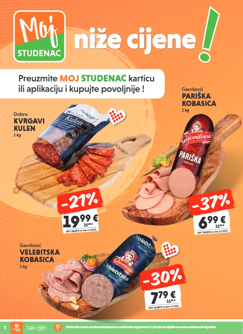 preuzmite moj studenac karticu ili aplikaciju i kupujte povoljnije ! 2 proizvodi s ovom oznakom dostupni su u odabranim trgovinama. lokacije provjerite na www.studenac.hr/trgovine niže cijene gavrilović pariška kobasica 1 kg 7 79 € mpc 11,01 € na dan 2.5.2025. 11 25 € -30% gavrilović velebitska kobasica 1 kg 19 99 € mpc 25,49 € na dan 2.5.2025. 25 49 € -21% 6 99 € mpc 10,50 € na dan 2.5.2025. 11 25 € -37% dobro kvrgavi kulen 1 kg