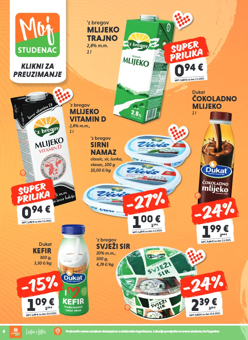 4 proizvodi s ovom oznakom dostupni su u odabranim trgovinama. lokacije provjerite na www.studenac.hr/trgovine 'z bregov mlijeko vitamin d 2,8% m.m., 1 l dukat kefir 300 g, 3,30 €/kg 1 09 € mpc 1,29 € na dan 23.9.2025. 1 29 € -15% 2 39 € mpc 3,05 € na dan 25.9.2025. 3 15 € -24% 0 94 € mpc 1,02 € na dan 2.5.2025. super prilika 0 94 € mpc 1,02 € na dan 2.5.2025. super prilika 'z bregov mlijeko trajno 2,8% m.m. 1 l 'z bregov sirni namaz classic, sir, šunka, vlasac, 100 g 10,00 €/kg 'z bregov svježi sir 20% m.m., 500 g, 4,78 €/kg dukat čokoladno mlijeko 1 l 1 99 € mpc 2,64 € na dan 2.5.2025. 2 64 € -24% 1 00 € mpc 1,29 € na dan 2.5.2025. 1 37 € -27% klikni za preuzimanje