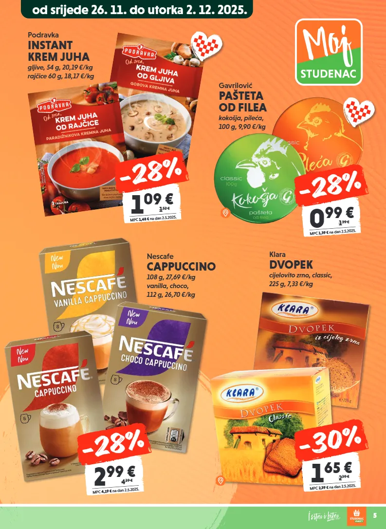 5 podravka instant krem juha gljive, 54 g, 20,19 €/kg rajčice 60 g, 18,17 €/kg gavrilović pašteta od filea kokošja, pileća, 100 g, 9,90 €/kg nescafe cappuccino 108 g, 27,69 €/kg vanilla, choco, 112 g, 26,70 €/kg klara dvopek cijelovito zrno, classic, 225 g, 7,33 €/kg 1 65 € mpc 2,39 € na dan 2.5.2025. 2 39 € -30% 0 99 € mpc 1,39 € na dan 2.5.2025. 1 39 € -28% 2 99 € mpc 4,19 € na dan 2.5.2025. 4 19 € -28% 1 09 € mpc 1,48 € na dan 2.5.2025. 1 52 € -28% od srijede 26. 11. do utorka 2. 12. 2025.