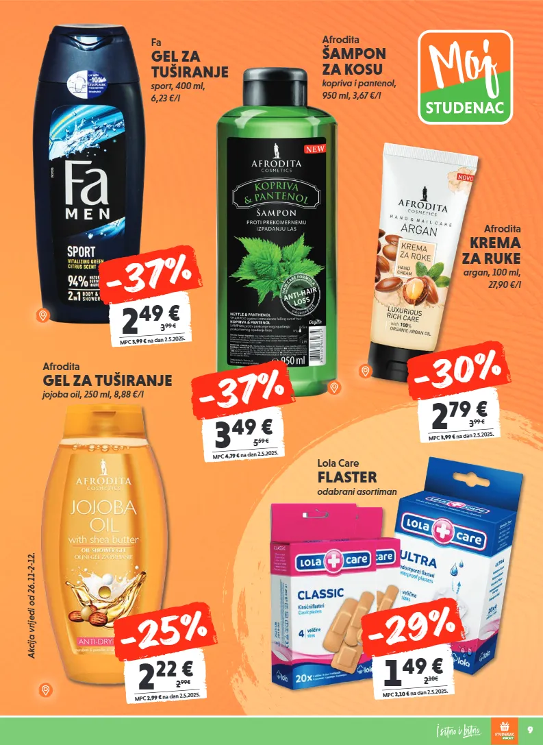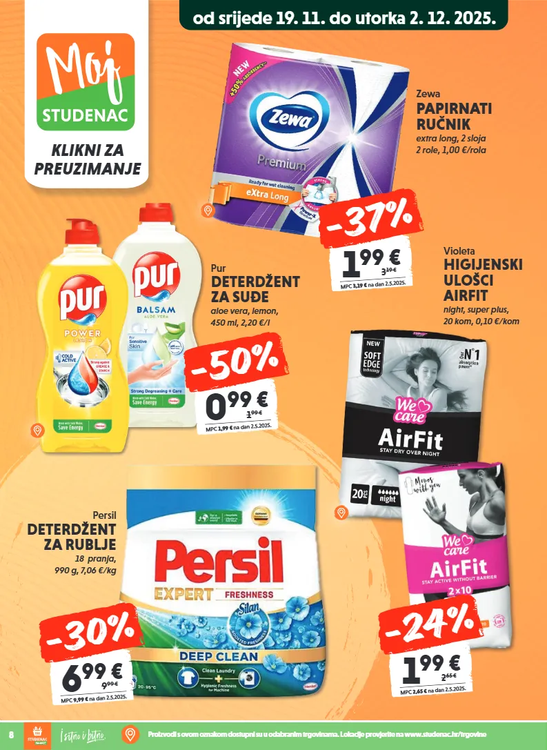 8 proizvodi s ovom oznakom dostupni su u odabranim trgovinama. lokacije provjerite na www.studenac.hr/trgovine klikni za preuzimanje od srijede 19. 11. do utorka 2. 12. 2025. 1 99 € mpc 3,19 € na dan 2.5.2025. 3 19 € -37% zewa papirnati ručnik extra long, 2 sloja 2 role, 1,00 €/rola violeta higijenski ulošci airfit night, super plus, 20 kom, 0,10 €/kom pur deterdžent za suđe aloe vera, lemon, 450 ml, 2,20 €/l persil deterdžent za rublje 18 pranja, 990 g, 7,06 €/kg 1 99 € mpc 2,65 € na dan 2.5.2025. 2 65 € -24% 6 99 € mpc 9,99 € na dan 2.5.2025. 9 99 € -30% 0 99 € mpc 1,99 € na dan 2.5.2025. 1 99 € -50%