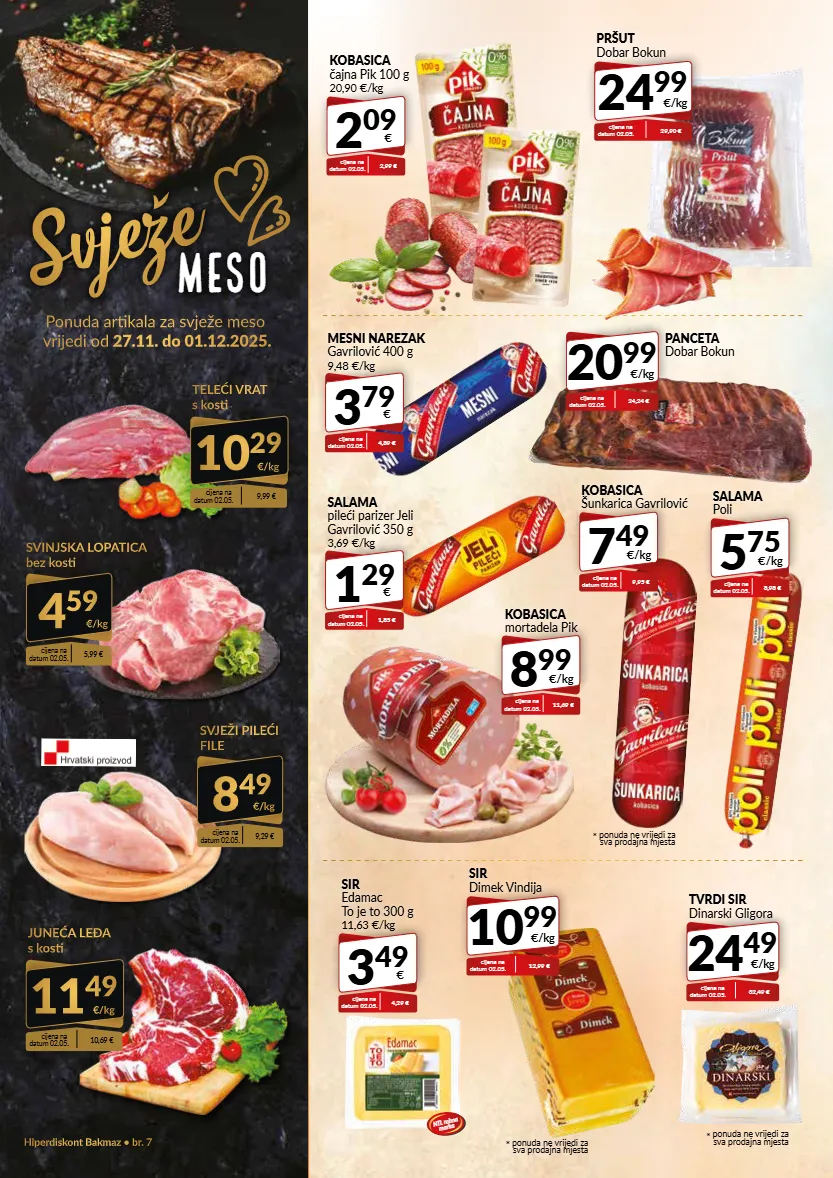 hiperdiskont bakmaz • br. 7 ponuda artikala za svježe meso vrijedi od 27.11. do 01.12.2025. svježe meso juneća leđa s kosti 11 49 €/kg cijena na datum 02.05. 10,69 € teleći vrat s kosti 10 29 €/kg cijena na datum 02.05. 9,99 € 4 59 €/kg svinjska lopatica bez kosti cijena na datum 02.05. 5,99 € 8 49 €/kg svježi pileći file cijena na datum 02.05. 9,29 € 2 09 € kobasica čajna pik 100 g 20,90 €/kg cijena na datum 02.05. 2,99 € panceta dobar bokun 20 99 €/kg cijena na datum 02.05. 24,24 € pršut dobar bokun 24 99 €/kg cijena na datum 02.05. 29,90 € 8 99 €/kg kobasica mortadela pik cijena na datum 02.05. 11,69 € 7 49 €/kg kobasica šunkarica gavrilović cijena na datum 02.05. 9,95 € * ponuda ne vrijedi za sva prodajna mjesta 5 75 €/kg salama poli cijena na datum 02.05. 8,98 € 3 79 € mesni narezak gavrilović 400 g 9,48 €/kg cijena na datum 02.05. 4,89 € 1 29 € salama pileći parizer jeli gavrilović 350 g 3,69 €/kg cijena na datum 02.05. 1,85 € tvrdi sir dinarski gligora 24 49 €/kg cijena na datum 02.05. 32,49 € * ponuda ne vrijedi za sva prodajna mjesta sir dimek vindija 10 99 €/kg cijena na datum 02.05. 12,99 € * ponuda ne vrijedi za sva prodajna mjesta 3 49 € sir edamac to je to 300 g 11,63 €/kg cijena na datum 02.05. 4,29 € ntl robna marka