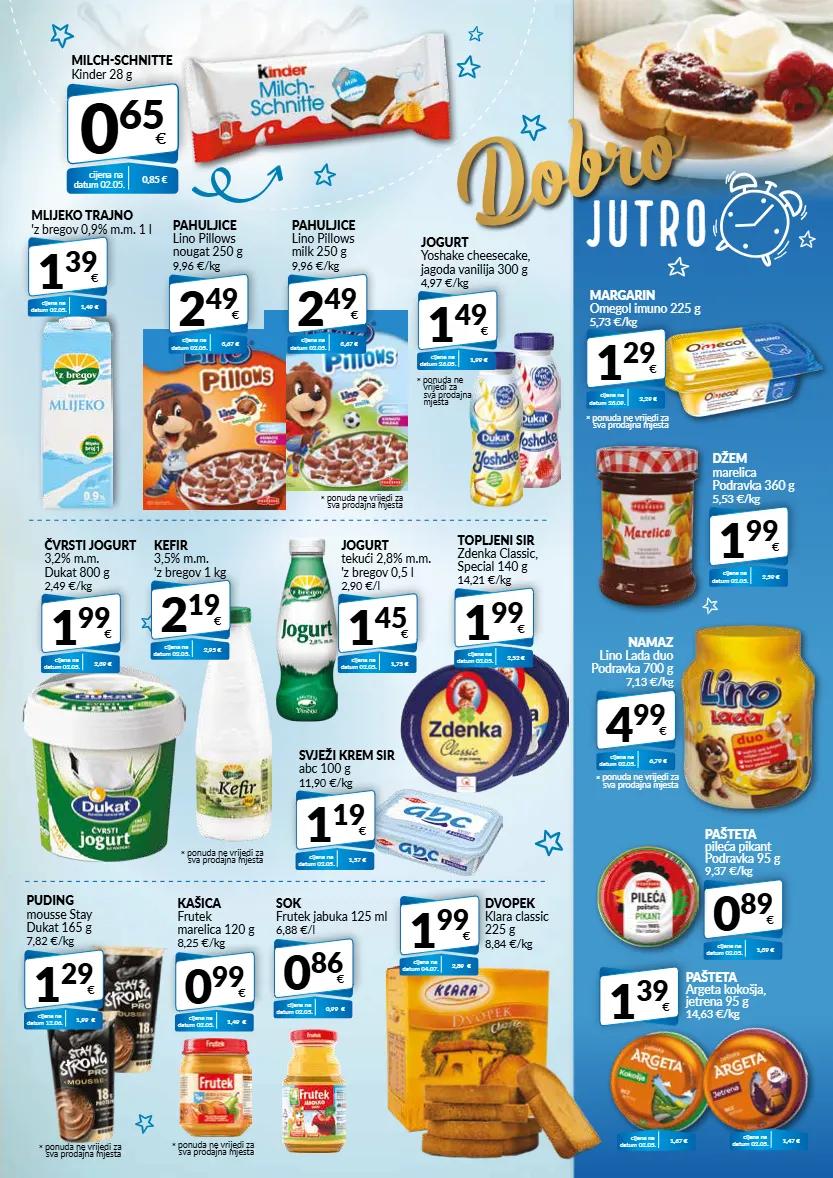 dobro jutro džem marelica podravka 360 g 5,53 €/kg 1 99 € cijena na datum 02.05. 2,59 € pašteta pileća pikant podravka 95 g 9,37 €/kg 0 89 € cijena na datum 02.05. 1,39 € 0 65 € milch-schnitte kinder 28 g cijena na datum 02.05. 0,85 € margarin omegol imuno 225 g 5,73 €/kg 1 29 € cijena na datum 23.09. 2,29 € * ponuda ne vrijedi za sva prodajna mjesta namaz lino lada duo podravka 700 g 7,13 €/kg 4 99 € cijena na datum 02.05. 6,79 € * ponuda ne vrijedi za sva prodajna mjesta mlijeko trajno 'z bregov 0,9% m.m. 1 l 1 39 € cijena na datum 02.05. 1,49 € pahuljice lino pillows nougat 250 g 9,96 €/kg 2 49 € cijena na datum 02.05. 3,67 € pahuljice lino pillows milk 250 g 9,96 €/kg 2 49 € cijena na datum 02.05. 3,67 € * ponuda ne vrijedi za sva prodajna mjesta čvrsti jogurt 3,2% m.m. dukat 800 g 2,49 €/kg 1 99 € cijena na datum 02.05. 2,39 € topljeni sir zdenka classic, special 140 g 14,21 €/kg 1 99 € cijena na datum 02.05. 2,52 € svježi krem sir abc 100 g 11,90 €/kg 1 19 € cijena na datum 02.05. 1,57 € jogurt tekući 2,8% m.m. 'z bregov 0,5 l 2,90 €/l 1 45 € cijena na datum 02.05. 1,75 € dvopek klara classic 225 g 8,84 €/kg 1 99 € cijena na datum 04.07. 2,89 € kašica frutek marelica 120 g 8,25 €/kg 0 99 € cijena na datum 02.05. 1,49 € * ponuda ne vrijedi za sva prodajna mjesta sok frutek jabuka 125 ml 6,88 €/l 0 86 € cijena na datum 02.05. 0,99 € puding mousse stay dukat 165 g 7,82 €/kg 1 29 € cijena na datum 12.06. 1,99 € jogurt yoshake cheesecake, jagoda vanilija 300 g 4,97 €/kg 1 49 € cijena na datum 26.05. 1,99 € * ponuda ne vrijedi za sva prodajna mjesta kefir 3,5% m.m. 'z bregov 1 kg 2 19 € cijena na datum 02.05. 2,95 € * ponuda ne vrijedi za sva prodajna mjesta * ponuda ne vrijedi za sva prodajna mjesta cijena na datum 02.05. 1,47 € cijena na datum 02.05. 1,67 € pašteta argeta kokošja, jetrena 95 g 14,63 €/kg 1 39 €