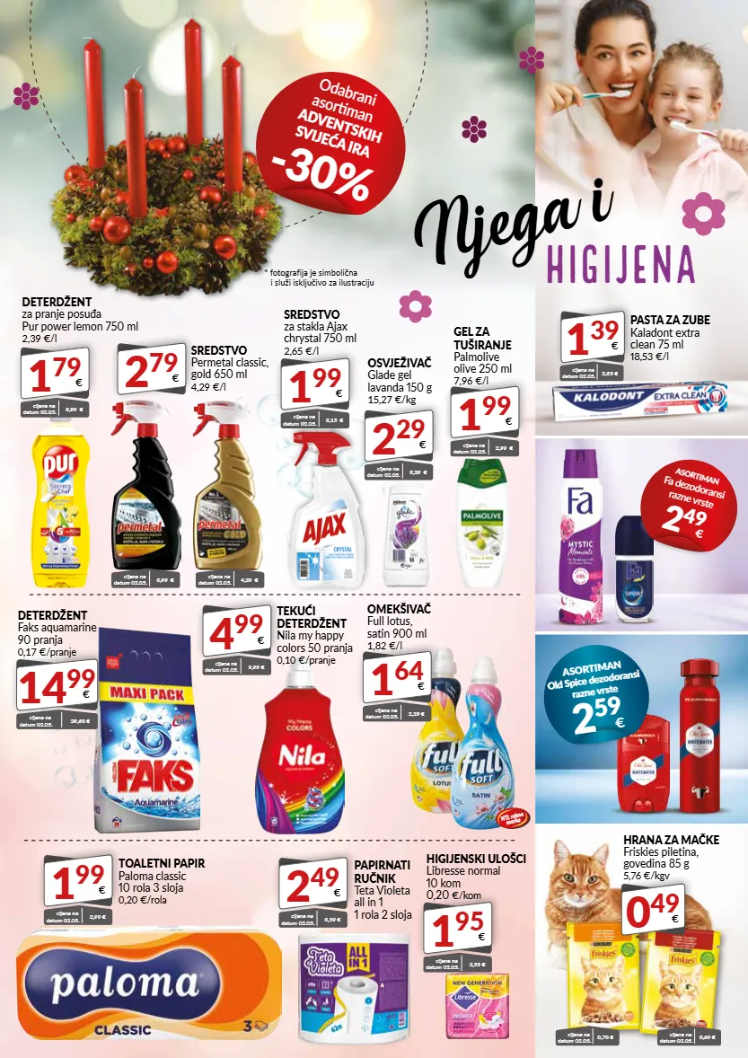 2 49 € papirnati ručnik teta violeta all in 1 1 rola 2 sloja cijena na datum 02.05. 3,59 € 1 99 € toaletni papir paloma classic 10 rola 3 sloja 0,20 €/rola cijena na datum 02.05. 2,99 € 2 29 € osvježivač glade gel lavanda 150 g 15,27 €/kg cijena na datum 02.05. 3,29 € 1 99 € gel za tuširanje palmolive olive 250 ml 7,96 €/l cijena na datum 02.05. 2,99 € cijena na datum 02.05. 4,29 € cijena na datum 02.05. 3,99 € 4 99 € tekući deterdžent nila my happy colors 50 pranja 0,10 €/pranje cijena na datum 02.05. 9,99 € deterdžent faks aquamarine 90 pranja 0,17 €/pranje 14 99 € cijena na datum 02.05. 29,60 € 1 64 € omekšivač full lotus, satin 900 ml 1,82 €/l cijena na datum 02.05. 2,29 € 1 95 € higijenski ulošci libresse normal 10 kom 0,20 €/kom cijena na datum 02.05. 2,55 € cijena na datum 02.05. 0,70 € 1 39 € pasta za zube kaladont extra clean 75 ml 18,53 €/l cijena na datum 02.05. 2,35 € cijena na datum 02.05. 0,69 € asortiman old spice dezodoransi razne vrste 2 59 € asortiman fa dezodoransi razne vrste 2 49 € ntl robna marka 0 49 € hrana za mačke friskies piletina, govedina 85 g 5,76 €/kgv njega i higijena odabrani asortiman adventskih svijeća ira -30% * fotografija je simbolična i služi isključivo za ilustraciju 1 99 € sredstvo za stakla ajax chrystal 750 ml 2,65 €/l cijena na datum 02.05. 3,15 € 2 79 € sredstvo permetal classic, gold 650 ml 4,29 €/l 1 79 € deterdžent za pranje posuđa pur power lemon 750 ml 2,39 €/l cijena na datum 02.05. 3,99 €