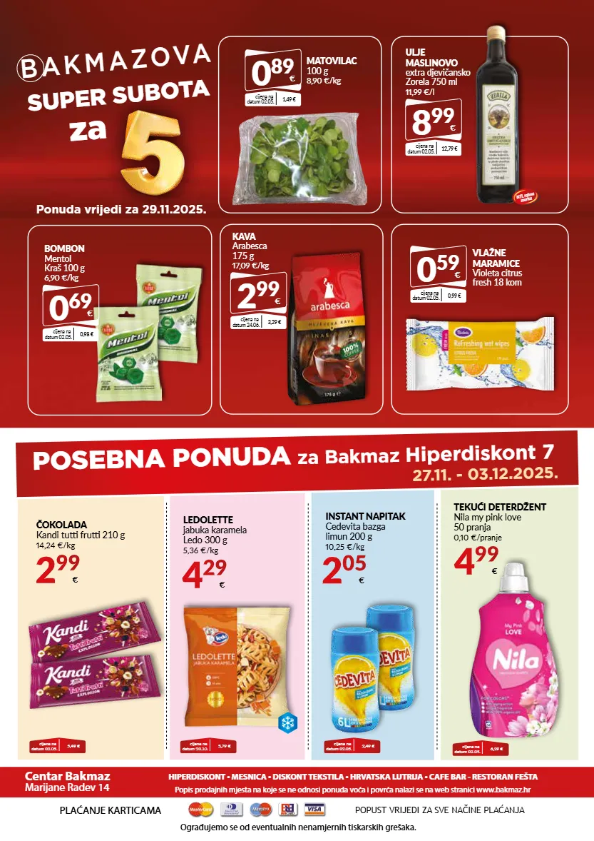 b a k m a z o va super subota za ponuda vrijedi za 29.11.2025. kapsule macchiato, cappuccino franck 198 g 161,56 kn/kg 21,44 €/kg 31 99 kn 4,25 € plaćanje karticama ograđujemo se od eventualnih nenamjernih tiskarskih grešaka. popust vrijedi za sve načine plaćanja centar bakmaz marijane radev 14 hiperdiskont • mesnica • diskont tekstila • hrvatska lutrija • cafe bar - restoran fešta popis prodajnih mjesta na koje se ne odnosi ponuda voća i povrća nalazi se na web stranici www.bakmaz.hr 27.11. - 03.12.2025. posebna ponuda za bakmaz hiperdiskont 7 čokolada kandi tutti frutti 210 g 14,24 €/kg 2 99 € instant napitak cedevita bazga limun 200 g 10,25 €/kg 2 05 € cijena na datum 02.05. 5,49 € cijena na datum 02.05. 2,49 € ulje maslinovo extra djevičansko zorela 750 ml 11,99 €/l 8 99 € cijena na datum 02.05. 12,79 € matovilac 100 g 8,90 €/kg 0 89 € cijena na datum 02.05. 1,49 € bombon mentol kraš 100 g 6,90 €/kg 0 69 € cijena na datum 02.05. 0,98 € vlažne maramice violeta citrus fresh 18 kom 0 59 € cijena na datum 02.05. 0,99 € tekući deterdžent nila my pink love 50 pranja 0,10 €/pranje 4 99 € cijena na datum 02.05. 6,29 € ledolette jabuka karamela ledo 300 g 5,36 €/kg 4 29 € cijena na datum 20.10. 5,79 € ntl robna marka kava arabesca 175 g 17,09 €/kg 2 99 € cijena na datum 24.06. 3,29 €