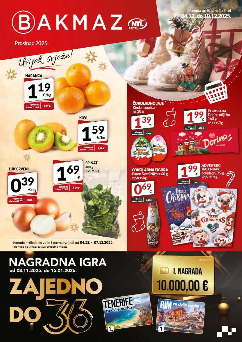 prosinac 2025. ponuda artikala vrijedi od 04.12. do 10.12.2025. nagradna igra od 03.11.2025. do 15.01.2026. zajedno do tenerife za dvije osobe 2. za dvije osobe rim 3. ponuda artikala za voće i povrće vrijedi od 04.12. - 07.12.2025. * ponuda ne vrijedi za sva prodajna mjesta luk crveni 0 39 €/kg cijena na datum 02.05. 0,84 € kiwi 1 59 €/kg cijena na datum 02.05. 2,99 € naranča 1 19 €/kg cijena na datum 02.05. 1,49 € špinat 400 g 4,23 €/kg 1 69 € cijena na datum 02.05. 2,49 € 1 39 € čokoladno jaje kinder suprise, lei 20 g cijena na datum 02.05. 1,60 € 0 69 € čokoladna figura baron sveti nikola 60 g 11,50 €/kg cijena na datum 10.11. 0,85 € 1 99 € čokolada dorina mlijeko 160 g 12,44 €/kg cijena na datum 20.10. 2,99 € 1 99 € adventski kalendar čokoladni 75 g 26,53 €/kg cijena na datum 10.11. 2,39 €