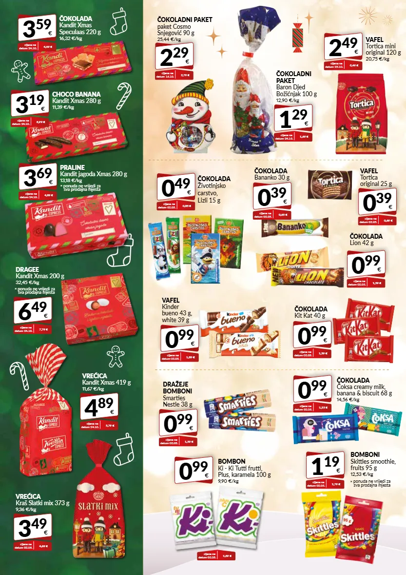 3 59 € čokolada kandit xmas speculaas 220 g 16,32 €/kg cijena na datum 24.10. 4,49 € * ponuda ne vrijedi za sva prodajna mjesta 6 49 € dragee kandit xmas 200 g 32,45 €/kg cijena na datum 24.10. 7,79 € 0 99 € vafel kinder bueno 43 g, white 39 g cijena na datum 02.05. 1,39 € 0 39 € čokolada bananko 30 g cijena na datum 02.05. 0,65 € 0 39 € vafel tortica original 25 g cijena na datum 02.05. 0,69 € 2 49 € vafel tortica mini original 120 g 20,75 €/kg cijena na datum 25.10. 3,49 € 0 99 € bombon ki - ki tutti frutti, plus, karamela 100 g 9,90 €/kg cijena na datum 02.05. 1,39 € 0 49 € čokolada životinjsko carstvo, lizli 15 g cijena na datum 02.05. 0,85 € 0 99 € čokolada lion 42 g cijena na datum 02.05. 1,59 € 0 99 € čokolada kit kat 40 g cijena na datum 02.05. 1,59 € 0 99 € dražeje bomboni smarties nestle 38 g cijena na datum 02.05. 1,59 € * ponuda ne vrijedi za sva prodajna mjesta 1 19 € bomboni skittles smoothie, fruits 95 g 12,53 €/kg cijena na datum 02.05. 1,79 € 4 89 € vrećica kandit xmas 419 g 11,67 €/kg cijena na datum 24.10. 5,79 € 3 49 € vrećica kraš slatki mix 373 g 9,36 €/kg cijena na datum 02.05. 4,69 € * ponuda ne vrijedi za sva prodajna mjesta 3 69 € praline kandit jagoda xmas 280 g 13,18 €/kg cijena na datum 24.10. 4,39 € 3 19 € choco banana kandit xmas 280 g 11,39 €/kg cijena na datum 24.10. 3,99 € 2 29 € čokoladni paket paket cosmo snjegović 90 g 25,44 €/kg cijena na datum 16.10. 2,79 € 0 99 € čokolada čoksa creamy milk, banana & biscuit 68 g 14,56 €/kg cijena na datum 02.05. 1,55 € 1 29 € čokoladni paket baron djed božićnjak 100 g 12,90 €/kg cijena na datum 24.10. 1,69 €