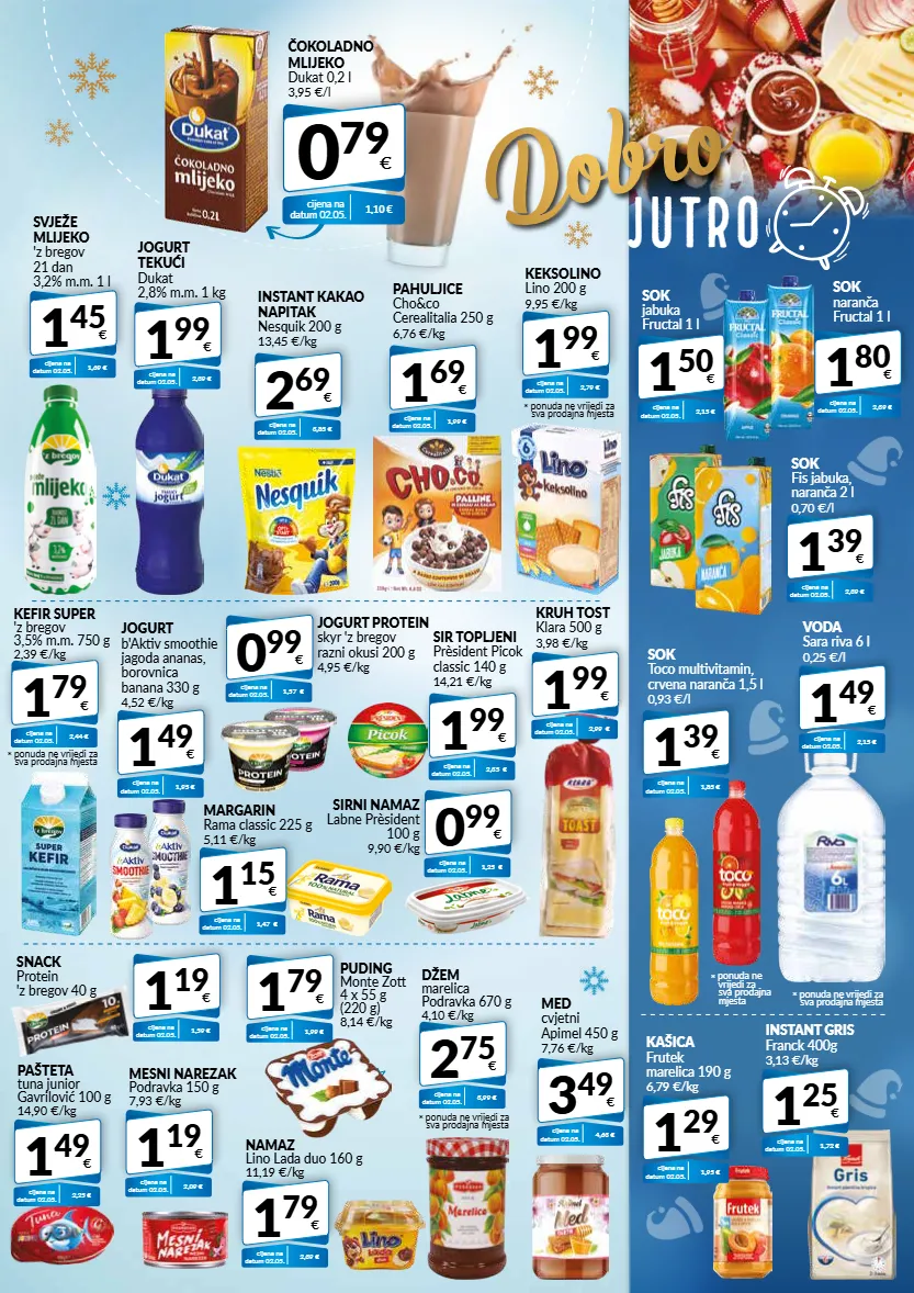 jogurt b'aktiv smoothie jagoda ananas, borovnica banana 330 g 4,52 €/kg 1 49 € cijena na datum 02.05. 1,95 € jogurt protein skyr 'z bregov razni okusi 200 g 4,95 €/kg 0 99 € cijena na datum 02.05. 1,57 € cijena na datum 02.05. 4,63 € med cvjetni apimel 450 g 7,76 €/kg 3 49 € 0 79 € čokoladno mlijeko dukat 0,2 l 3,95 €/l cijena na datum 02.05. 1,10 € dobro jutro pahuljice cho&co cerealitalia 250 g 6,76 €/kg 1 69 € cijena na datum 02.05. 1,99 € * ponuda ne vrijedi za sva prodajna mjesta keksolino lino 200 g 9,95 €/kg 1 99 € cijena na datum 02.05. 2,79 € instant kakao napitak nesquik 200 g 13,45 €/kg 2 69 € cijena na datum 02.05. 3,85 € kašica frutek marelica 190 g 6,79 €/kg 1 29 € cijena na datum 02.05. 1,95 € jogurt tekući dukat 2,8% m.m. 1 kg 1 99 € cijena na datum 02.05. 2,39 € svježe mlijeko 'z bregov 21 dan 3,2% m.m. 1 l 1 45 € cijena na datum 02.05. 1,69 € kefir super 'z bregov 3,5% m.m. 750 g 2,39 €/kg 1 79 € cijena na datum 02.05. 2,44 € * ponuda ne vrijedi za sva prodajna mjesta margarin rama classic 225 g 5,11 €/kg 1 15 € cijena na datum 02.05. 1,47 € sirni namaz labne prèsident 100 g 9,90 €/kg 0 99 € cijena na datum 02.05. 1,25 € sir topljeni prèsident picok classic 140 g 14,21 €/kg 1 99 € cijena na datum 02.05. 2,35 € kruh tost klara 500 g 3,98 €/kg 1 99 € cijena na datum 02.05. 2,99 € pašteta tuna junior gavrilović 100 g 14,90 €/kg 1 49 € cijena na datum 02.05. 2,25 € mesni narezak podravka 150 g 7,93 €/kg 1 19 € cijena na datum 02.05. 2,09 € namaz lino lada duo 160 g 11,19 €/kg 1 79 € cijena na datum 02.05. 2,39 € cijena na datum 02.05. 1,59 € snack protein 'z bregov 40 g 1 19 € džem marelica podravka 670 g 4,10 €/kg 2 75 € cijena na datum 02.05. 3,99 € * ponuda ne vrijedi za sva prodajna mjesta cijena na datum 02.05. 1,99 € puding monte zott 4 x 55 g (220 g) 8,14 €/kg 1 79 € sok toco multivitamin, crvena naranča 1,5 l 0,93 €/l 1 39 € cijena na datum 02.05. 1,85 € sok fis jabuka, naranča 2 l 0,70 €/l 1 39 € cijena na datum 02.05. 2,39 € sok naranča fructal 1 l 1 80 € cijena na datum 02.05. 2,39 € * ponuda ne vrijedi za sva prodajna mjesta voda sara riva 6 l 0,25 €/l 1 49 € cijena na datum 02.05. 2,15 € * ponuda ne vrijedi za sva prodajna mjesta instant gris franck 400g 3,13 €/kg 1 25 € cijena na datum 02.05. 1,72 € sok jabuka fructal 1 l 1 50 € cijena na datum 02.05. 2,15 €
