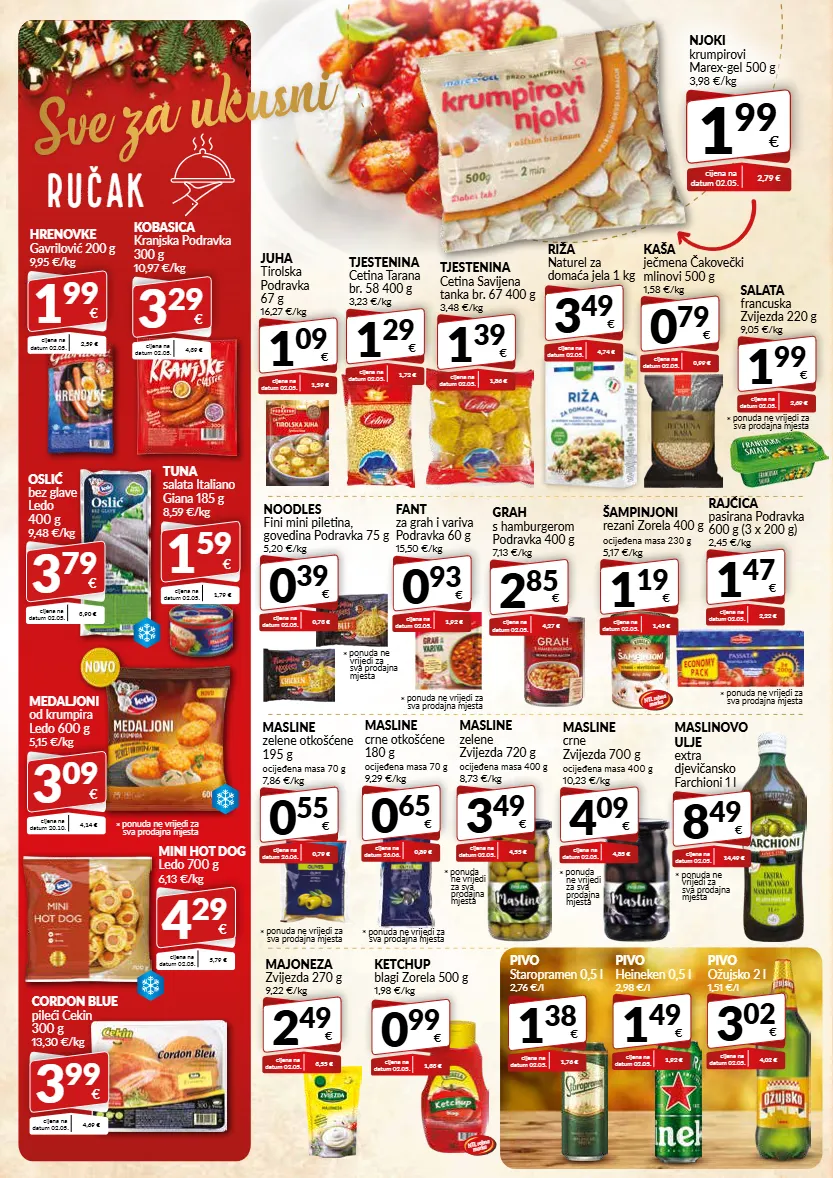 sve za ukusni ručak kobasica kranjska podravka 300 g 10,97 €/kg 3 29 € cijena na datum 02.05. 4,39 € hrenovke gavrilović 200 g 9,95 €/kg 1 99 € cijena na datum 02.05. 2,59 € cordon blue pileći cekin 300 g 13,30 €/kg 3 99 € cijena na datum 02.05. 4,69 € oslić bez glave ledo 400 g 9,48 €/kg 3 79 € cijena na datum 02.05. 3,90 € mini hot dog ledo 700 g 6,13 €/kg 4 29 € cijena na datum 02.05. 5,79 € 0 79 € kaša ječmena čakovečki mlinovi 500 g 1,58 €/kg cijena na datum 02.05. 0,99 € 1 29 € tjestenina cetina tarana br. 58 400 g 3,23 €/kg cijena na datum 02.05. 1,72 € 1 09 € juha tirolska podravka 67 g 16,27 €/kg cijena na datum 02.05. 1,59 € 1 39 € tjestenina cetina savijena tanka br. 67 400 g 3,48 €/kg cijena na datum 02.05. 1,86 € 1 47 € rajčica pasirana podravka 600 g (3 x 200 g) 2,45 €/kg cijena na datum 02.05. 2,22 € 3 49 € riža naturel za domaća jela 1 kg cijena na datum 02.05. 4,74 € 2 49 € majoneza zvijezda 270 g 9,22 €/kg cijena na datum 02.05. 3,55 € 0 99 € ketchup blagi zorela 500 g 1,98 €/kg cijena na datum 02.05. 1,33 € 8 49 € maslinovo ulje extra djevičansko farchioni 1 l cijena na datum 02.05. 14,49 € * ponuda ne vrijedi za sva prodajna mjesta ntl robna marka ntl robna marka njoki krumpirovi marex-gel 500 g 3,98 €/kg 1 99 € cijena na datum 02.05. 2,79 € medaljoni od krumpira ledo 600 g 5,15 €/kg 3 09 € cijena na datum 20.10. 4,14 € * ponuda ne vrijedi za sva prodajna mjesta tuna salata italiano giana 185 g 8,59 €/kg 1 59 € cijena na datum 02.05. 1,79 € 1 19 € šampinjoni rezani zorela 400 g ocijeđena masa 230 g 5,17 €/kg cijena na datum 02.05. 1,45 € 2 85 € grah s hamburgerom podravka 400 g 7,13 €/kg cijena na datum 02.05. 4,27 € * ponuda ne vrijedi za sva prodajna mjesta 0 93 € fant za grah i variva podravka 60 g 15,50 €/kg cijena na datum 02.05. 1,92 € * ponuda ne vrijedi za sva prodajna mjesta * ponuda ne vrijedi za sva prodajna mjesta 1 99 € salata francuska zvijezda 220 g 9,05 €/kg cijena na datum 02.05. 2,69 € 3 49 € masline zelene zvijezda 720 g ocijeđena masa 400 g 8,73 €/kg cijena na datum 02.05. 4,55 € 4 09 € masline crne zvijezda 700 g ocijeđena masa 400 g 10,23 €/kg cijena na datum 02.05. 4,85 € 0 65 € masline crne otkošćene 180 g ocijeđena masa 70 g 9,29 €/kg cijena na datum 26.06. 0,89 € * ponuda ne vrijedi za sva prodajna mjesta * ponuda ne vrijedi za sva prodajna mjesta 0 55 € masline zelene otkošćene 195 g ocijeđena masa 70 g 7,86 €/kg cijena na datum 26.06. 0,79 € * ponuda ne vrijedi za sva prodajna mjesta 0 39 € noodles fini mini piletina, govedina podravka 75 g 5,20 €/kg cijena na datum 02.05. 0,73 € 3 02 € pivo ožujsko 2 l 1,51 €/l cijena na datum 02.05. 4,02 € 1 49 € pivo heineken 0,5 l 2,98 €/l cijena na datum 02.05. 1,92 € 1 38 € pivo staropramen 0,5 l 2,76 €/l cijena na datum 02.05. 1,76 € * ponuda ne vrijedi za sva prodajna mjesta * ponuda ne vrijedi za sva prodajna mjesta