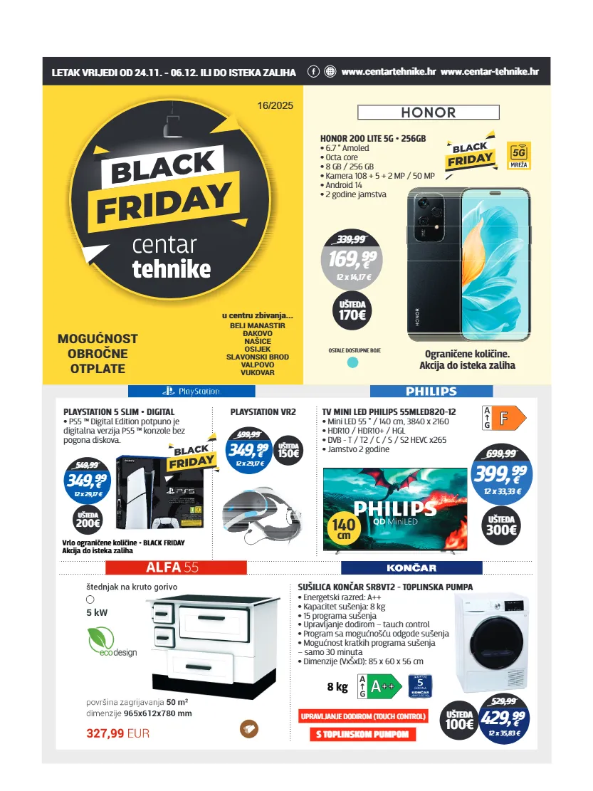 16/2025 u centru zbivanja... beli manastir đakovo našice osijek slavonski brod valpovo vukovar letak vrijedi od 24.11. - 06.12. ili do isteka zaliha www.centartehnike.hr www.centar-tehnike.hr mogućnost obročne otplate honor 200 lite 5g • 256gb 6.7 " amoled • octa core • 8 gb / 256 gb • kamera 108 + 5 + 2 mp / 50 mp • android 14 • 2 godine jamstva • € 12 x 28,33 € 499,⁹⁹ 12 x 41,66 € 339,99 169,⁹⁹ € 12 x 14,17 € ušteda 170€ ograničene količine. akcija do isteka zaliha ostale dostupne boje playstation 5 slim • digital ps5 ™ digital edition potpuno je • digitalna verzija ps5 ™ konzole bez pogona diskova. 549,99 349,⁹⁹ € 12 x 29,17 € ušteda 200€ vrlo ograničene količine black friday • akcija do isteka zaliha tv mini led philips 55mled820-12 mini led 55 " / 140 cm, 3840 x 2160 • hdr10 / hdr10+ / hgl • dvb - t / t2 / c / s / s2 hevc x265 • jamstvo 2 godine • 699,99 399,⁹⁹ € 12 x 33,33 € ušteda 300€ 140 cm € 12 x 28,33 € sušilica končar sr8vt2 - toplinska pumpa energetski razred: a++ • kapacitet sušenja: 8 kg • 15 programa sušenja • upravljanje dodirom – tauch control • program sa mogućnošću odgode sušenja • mogućnost kratkih programa sušenja • – samo 30 minuta dimenzije (vxšxd): 85 x 60 x 56 cm • ušteda 100€ € s toplinskom pumpom playstation vr2 499,99 349,⁹⁹ € 12 x 29,17 € ušteda 150€ upravljanje dodirom (touch control) € 529,99 429,⁹⁹ € 12 x 35,83 € 8 kg