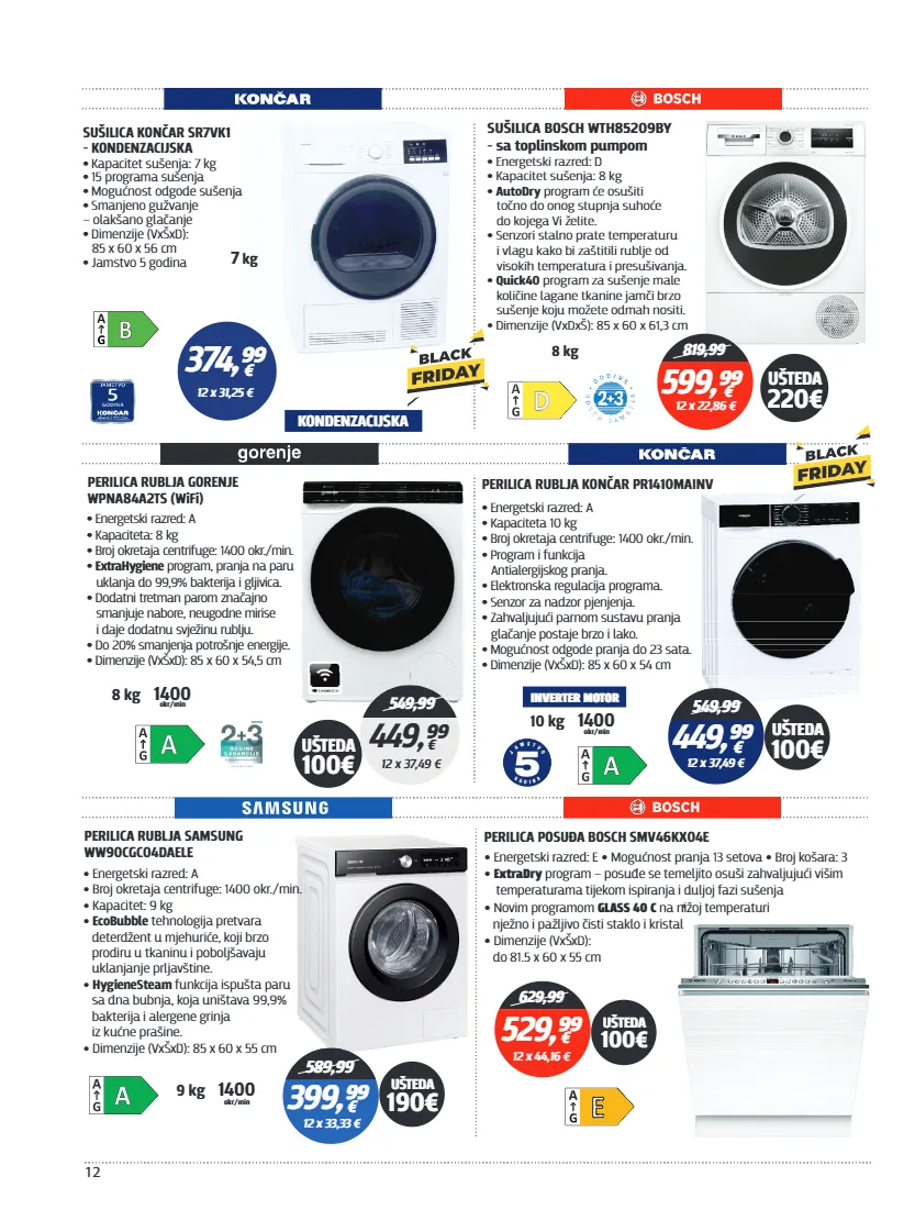 12 sušilica končar sr7vk1 - kondenzacijska kapacitet sušenja: 7 kg • 15 programa sušenja • mogućnost odgode sušenja • smanjeno gužvanje • – olakšano glačanje dimenzije (vxšxd): • 85 x 60 x 56 cm jamstvo 5 godina • kondenzacijska kg 7 374,⁹⁹ € 12 x 31,25 € sušilica bosch wth85209by - sa toplinskom pumpom • energetski razred: d kapacitet sušenja: 8 kg • program će osušiti • autodry točno do onog stupnja suhoće do kojega vi želite. senzori stalno prate temperaturu • i vlagu kako bi zaštitili rublje od visokih temperatura i presušivanja. program za sušenje male • quick40 količine lagane tkanine jamči brzo sušenje koju možete odmah nositi. dimenzije (vxdxš): 85 x 60 x 61,3 cm • ušteda 220€ 819,99 599,⁹⁹ € 12 x 22,86 € d d 8 kg perilica rublja gorenje wpna84a2ts (wifi) • energetski razred: a kapaciteta: 8 kg • broj okretaja centrifuge: 1400 okr./min. • program, pranja na paru • extrahygiene uklanja do 99,9% bakterija i gljivica. dodatni tretman parom značajno • smanjuje nabore, neugodne mirise i daje dodatnu svježinu rublju. do 20% smanjenja potrošnje energije. • dimenzije (vxšxd): 85 x 60 x 54,5 cm • ušteda 100€ 8 kg 1400 okr/min 549,99 449 ,⁹⁹ € 12 x 37,49 € perilica rublja končar pr1410mainv • energetski razred: a kapaciteta 10 kg • broj okretaja centrifuge: 1400 okr./min. • program i funkcija • antialergijskog pranja. elektronska regulacija programa. • senzor za nadzor pjenjenja. • zahvaljujući parnom sustavu pranja • glačanje postaje brzo i lako. mogućnost odgode pranja do 23 sata. • dimenzije (vxšxd): 85 x 60 x 54 cm • okr/min 549,99 449,⁹⁹ € 12 x 37,49 € ušteda 100€ inverter motor 10 kg 1400 589,99 399,⁹⁹ € 12 x 33,33 € 9 kg 1400 okr/min • energetski razred: a broj okretaja centrifuge: 1400 okr./min. • kapacitet: 9 kg • • tehnologija pretvara ecobubble deterdžent u mjehuriće, koji brzo prodiru u tkaninu i poboljšavaju uklanjanje prljavštine. funkcija ispušta paru • hygienesteam sa dna bubnja, koja uništava 99,9% bakterija i alergene grinja iz kućne prašine. dimenzije (vxšxd): 85 x 60 x 55 cm • perilica rublja samsung ww90cgc04daele ušteda 190€ • • • energetski razred: e mogućnost pranja 13 setova broj košara: 3 program – posuđe se temeljito osuši zahvaljujući višim • extradry temperaturama tijekom ispiranja i duljoj fazi sušenja novim programom na nižoj temperaturi • glass 40 c nježno i pažljivo čisti staklo i kristal dimenzije (vxšxd): • do 81.5 x 60 x 55 cm perilica posuđa bosch smv46kx04e 629,99 529,⁹⁹ € 12 x 44,16 € ušteda 100€