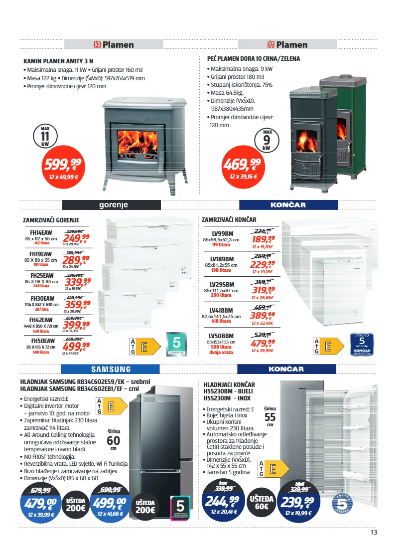13 12 x 28,33 € peć plamen dora 10 crna/zelena • maksimalna snaga: 9 kw • grijani prostor 180 m3 stupanj iskorištenja: 75% • • masa 64.5kg, dimenzije (vxšxd): • 987x380x435mm promjer dimovodne cijevi: • 2 1 0 mm max 9 kw 469,⁹⁹ € 12 x 39,16 € kamin 3 n plamen amity • • maksimalna snaga: 11 kw grijani prostor 160 m3 • • masa 122 kg dimenzije (šxvxd): 597x764x519 mm • 2 promjer dimovodne cijevi: 1 0 mm max 11 kw 599,⁹⁹ € 12 x 49,99 € zamrzivači končar lv99bm 85x56,5x52,3 cm 99 litara lv189bm 85x81,2x55 cm 198 litara lv295bm 85x111,5x67 cm 290 litara lv418bm 82,5x141,5x75 cm 418 litara 12 x 15, 83€ 189, € 99 lv508bm 83x153x73,5 cm 508 litara dvoja vrata 224, € 99 12 x 19, 16€ 229, € 99 269, € 99 12 x 26, 66€ 319, € 99 359, € 99 12 x 32, 49€ 389, € 99 459, € 99 12 x 39,99 € 479, € 99 529, € 99 fh14eaw 85 x 62 x 55 cm 142 litara 249, € 289, 99€ 12 x 20, 83€ 99 fh19eaw 85 x 89 x 55 cm 191 litara 289, € 339, 99€ 12 x 24, 16€ 99 fh25eaw 85 x 96 x 63 cm 248 litara 339, € 389, 99€ 12 x 19, 91€ 99 fh30eaw 1114 x 847 x 630 cm 297 litra zamrzivači gorenje 359, € 429, 99€ 12 x 29, 99€ 99 fh42eaw 1448 x 850 x 721 cm 420 litara 399, € 469, 99€ 12 x 33, 33€ 99 fh50eaw 85 x 165 x 72 cm 500 litara 499, € 469, 99€ 99 12 x 41, 66€ hladnjaci končar h55230bm - bijeli h55230im - inox • energetski razred: e boje: bijela i inox • ukupni korisni • volumen 230 litara automatsko odleđivanje • prostora za hlađenje četiri staklene posude i posuda za povrće. dimenzije (vxšxd): • 142 x 55 x 55 cm jamstvo 5 godina • 55 širina cm 309,99 247,⁹⁹ € 12 x 20,66 € 299,99 239,⁹⁹ € 12 x 19,99 € popust 20% bijeli 339,99 244,⁹⁹ € 12 x 20,41 € 329,99 239,⁹⁹ € 12 x 19,99 € ušteda 60€ bijeli inox • energetski razred:e digitalni inverter motor • – jamstvo 10. god. na motor zapremina: hladnjak 230 litara • zamrzivač 114 litara all-around colling tehnologija • omogućava održavanje stalne temperature i ravno hladi no frost tehnologija. • reverzibilna vrata, led svjetlo, wi-fi funkcija • brzo hlađenje i zamrzavanje na zahtjev • dimenzije (vxšxd):185 x 60 x 60 • cm širina 60 hladnjak samsung rb34c602es9/ek – srebrni hladnjak samsung rb34c602eb1/ef – crni € 12 x 45,83 € 679,99 479,⁰⁰ € 12 x 39,99 € ušteda 200€ € 12 x 45,83 € 699,99 499,⁰⁰ € 12 x 41,66 € ušteda 200€ € 12 x 45,83 € 679,99 479,⁰⁰ € 12 x 39,99 €