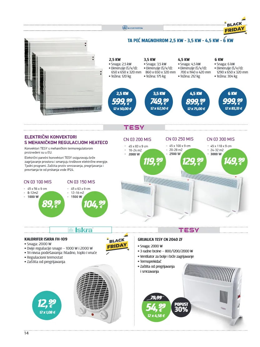14 749,⁹⁹ € 12 x 62,50 € 599,⁹⁹ € 12 x 50,00 € 2,5 kw 3,5 kw 999,⁹⁹ € 12 x 83,33 € 899,⁹⁹ € 12 x 75,00 € 4,5 kw 6 kw 2,5 kw • snaga: 2,5 kw dimenzije (š/v/d): • 650 x 650 x 320 mm težina: 120 kg • ta peć magnohrom 2,5 kw - 3,5 kw - 4,5 kw - 6 kw • snaga: 3,5 kw dimenzije (š/v/d): • 860 x 650 x 320 mm težina: 175 kg • • snaga: 4,5 kw dimenzije (š/v/d): • 700 x 1140 x 420 mm težina: 212 kg • • snaga: 6 kw dimenzije (š/v/d): • 1290 x 650 x 320 mm težina: 304 kg • 3,5 kw 4,5 kw 6 kw 149,⁹⁹ € 129,⁹⁹ € 89,⁹⁹ € 119,⁹⁹ € 104,⁹⁹ € grijalica tesy cn 2040 zf • snaga: 2000 w • 3 radne brzine – 800/1200/2000 w • ventilator za bolje i brže zagrijavanje • termoprekidač • zaštita od pregrijavanja i smrzavanja 79,99 54,⁹⁹ € 12 x 4,58 € popust 30% kalorifer iskra fh-109 • snaga: 2000 w dvije regulacije snage – 1000 w i 2000 w • tri nivoa podešavanja: hladno, toplo i vruće • regulacioni termostat • zaštita od pregrijavanja • 12,⁹⁹ € 12 x 1,08 €