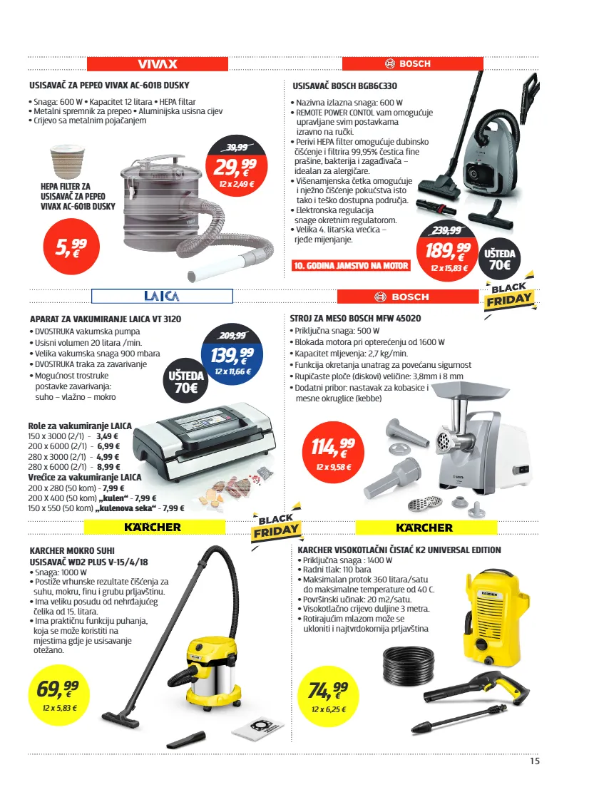 15 usisavač za pepeo vivax ac-601b dusky • • • snaga: 600 w kapacitet 12 litara hepa filtar • • metalni spremnik za prepeo aluminijska usisna cijev • crijevo sa metalnim pojačanjem 5,⁹⁹ € hepa filter za usisavač za pepeo vivax ac-601b dusky 39,99 29,⁹⁹ € 12 x 2,49 € usisavač bosch bgb6c330 • nazivna izlazna snaga: 600 w remote power contol vam omogućuje • upravljane svim postavkama izravno na ručki. perivi hepa filter omogućuje dubinsko • čišćenje i filtrira 99,95% čestica fine prašine, bakterija i zagađivača – idealan za alergičare. višenamjenska četka omogućuje • i nježno čišćenje pokućstva isto tako i teško dostupna područja. elektronska regulacija • snage okretnim regulatorom. velika 4. litarska vrećica – • rjeđe mijenjanje. ušteda 70€ 12 x 15,83 € 239,99 189,⁹⁹ € 10. godina jamstvo na motor aparat za vakumiranje laica vt 3120 • dvostruka vakumska pumpa usisni volumen 20 litara /min. • velika vakumska snaga 900 mbara • dvostruka traka za zavarivanje • mogućnost trostruke • postavke zavarivanja: suho – vlažno – mokro role za vakumiranje laica 150 x 3000 (2/1) - 3,49 € 200 x 6000 (2/1) - 6,99 € 4,99 280 x 3000 (2/1) - € 8,99 280 x 6000 (2/1) - € vrećice za vakumiranje laica 200 x 280 (50 kom) - 7,99 € 200 x 400 (50 kom) - „kulen“ 7,99 € 7,99 150 x 550 (50 kom) - „kulenova seka“ € 209,99 139,⁹⁹ € 12 x 11,66 € ušteda 70€ stroj za meso bosch mfw 45020 • priključna snaga: 500 w blokada motora pri opterećenju od 1600 w • kapacitet mljevenja: 2,7 kg/min. • funkcija okretanja unatrag za povećanu sigurnost • rupičaste ploče (diskovi) veličine: 3,8mm i 8 mm • dodatni pribor: nastavak za kobasice i • mesne okruglice (kebbe) 114,⁹⁹ € 12 x 9,58 € karcher mokro suhi usisavač wd2 plus v-15/4/18 • snaga: 1000 w postiže vrhunske rezultate čišćenja za • suhu, mokru, finu i grubu prljavštinu. ima veliku posudu od nehrđajućeg • čelika od 15. litara. ima praktičnu funkciju puhanja, • koja se može koristiti na mjestima gdje je usisavanje otežano. 69,⁹⁹ € 12 x 5,83 € karcher visokotlačni čistać k2 universal edition • priključna snaga : 1400 w radni tlak: 110 bara • maksimalan protok 360 litara/satu • do maksimalne temperature od 40 c. površinski učinak: 20 m2/satu. • visokotlačno crijevo duljine 3 metra. • rotirajućim mlazom može se • ukloniti i najtvrdokornija prljavština 74,⁹⁹ € 12 x 6,25 €
