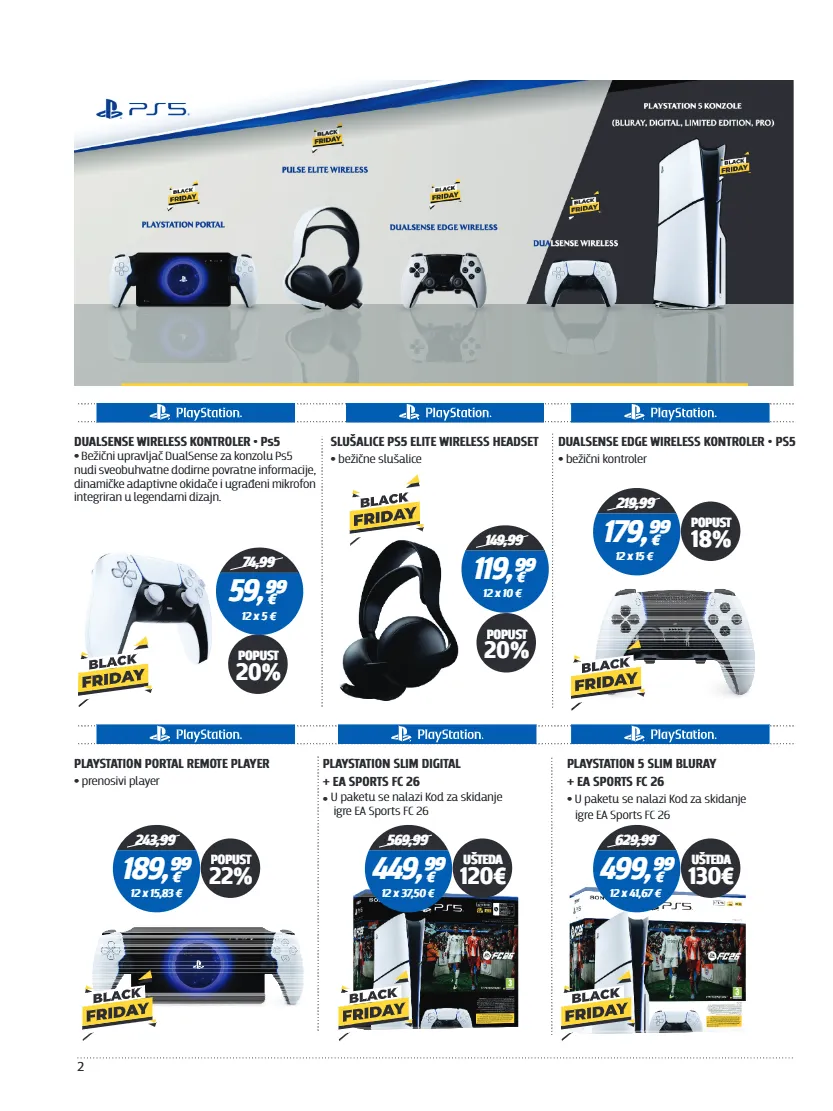 2 dualsense wireless kontroler • ps5 • bežični upravljač dualsense za konzolu ps5 nudi sveobuhvatne dodirne povratne informacije, dinamičke adaptivne okidače i ugrađeni mikrofon integriran u legendarni dizajn. popust 20% 149,99 119,⁹⁹ € 12 x 10 € popust 20% 219,99 179,⁹⁹ € 12 x 15 € popust 18% slušalice ps5 elite wireless headset • bežične slušalice dualsense edge wireless kontroler • ps5 • bežični kontroler 243,99 189,⁹⁹ € 12 x 15,83 € popust 22% 629,99 499,⁹⁹ € 12 x 41,67 € ušteda 130€ playstation portal remote player • prenosivi player playstation slim digital + ea sports fc 26 • playstation 5 slim bluray + ea sports fc 26 • u paketu se nalazi kod za skidanje igre ea sports fc 26 u paketu se nalazi kod za skidanje igre ea sports fc 26 74,99 59,⁹⁹ € 12 x 5 € 569,99 449,⁹⁹ € 12 x 37,50 € ušteda 120€