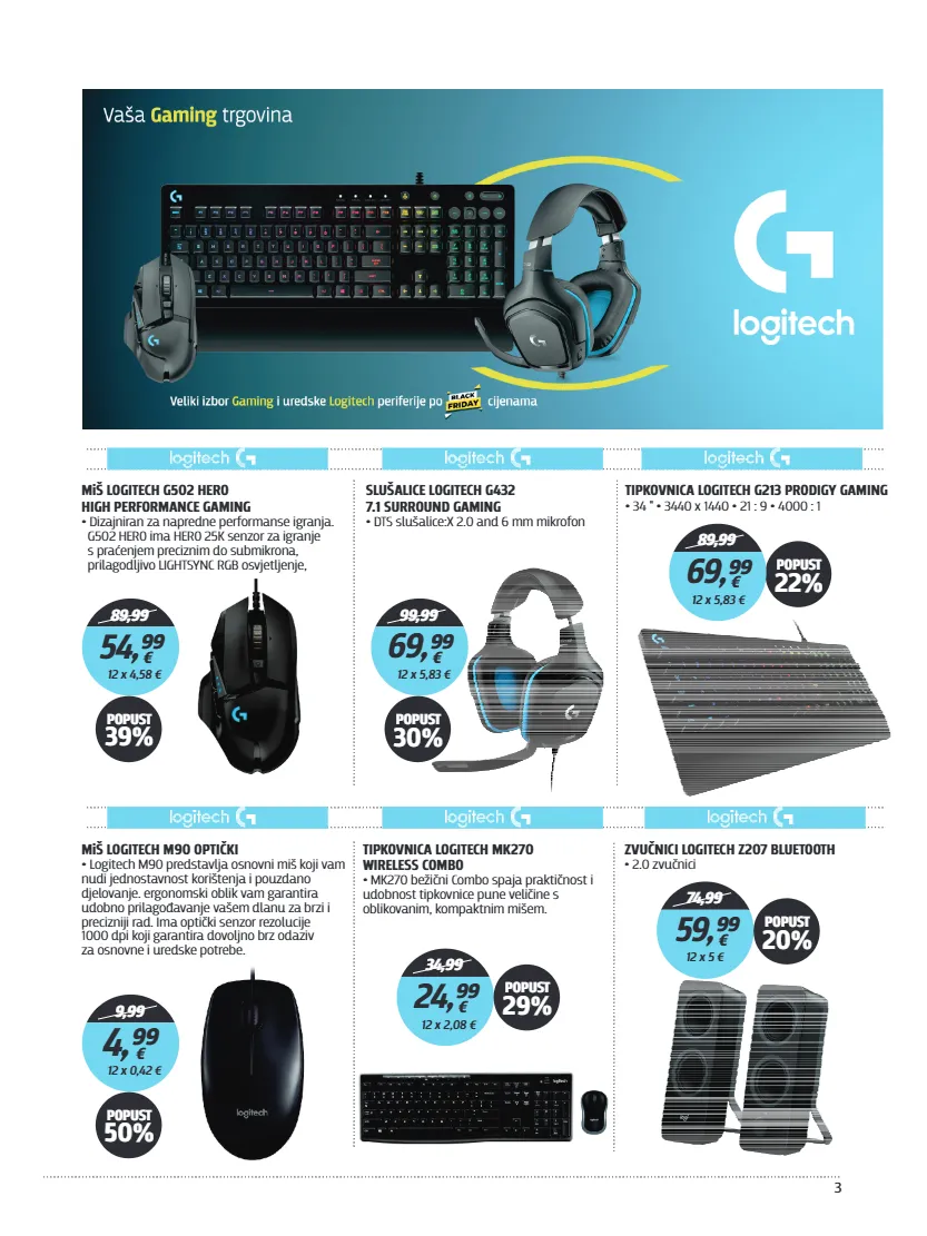 3 miš logitech g502 hero high performance gaming dizajniran za napredne performanse igranja. • g502 hero ima hero 25k senzor za igranje s praćenjem preciznim do submikrona, prilagodljivo lightsync rgb osvjetljenje, slušalice logitech g432 7.1 surround gaming dts slušalice:x 2.0 and 6 mm mikrofon • tipkovnica logitech g213 prodigy gaming 34 " 3440 x 1440 21 : 9 4000 : 1 • • • • 89,99 € 12 x 4,58 € 54,⁹⁹ popust 39% 99,99 € 12 x 5,83 € 69,⁹⁹ popust 30% popust 22% 9,99 € 12 x 0,42 € 4,⁹⁹ popust 50% 34,99 € 12 x 2,08 € 24,⁹⁹ popust 29% miš logitech m90 optički logitech m90 predstavlja osnovni miš koji vam • nudi jednostavnost korištenja i pouzdano djelovanje. ergonomski oblik vam garantira udobno prilagođavanje vašem dlanu za brzi i precizniji rad. ima optički senzor rezolucije 1000 dpi koji garantira dovoljno brz odaziv za osnovne i uredske potrebe. tipkovnica logitech mk270 wireless combo mk270 bežični combo spaja praktičnost i • udobnost tipkovnice pune veličine s oblikovanim, kompaktnim mišem. zvučnici logitech z207 bluetooth 2.0 zvučnici • 89,99 € 12 x 5,83 € 69,⁹⁹ 74,99 € 12 x 5 € 59,⁹⁹ popust 20%