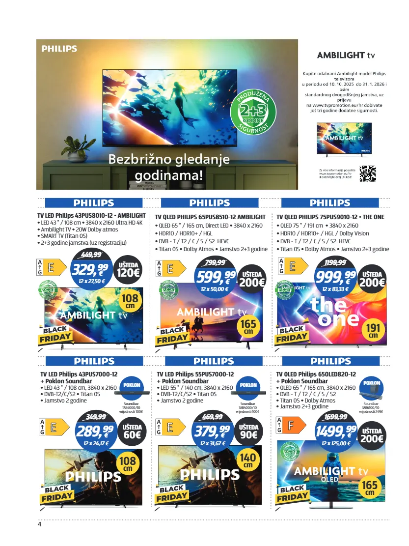4 tv led philips 43pus8010-12 • ambilight • • led 43 " / 108 cm 3840 x 2160 ultra hd 4k ambilight tv 20w dolby atmos • • smart tv (titan os) • 2+3 godine jamstva (uz registraciju) • 449,99 329,⁹⁹ € 12 x 27,50 € ušteda 120€ 108 cm tv qled philips 65pus8510-12 ambilight • • qled 65 " / 165 cm, direct led 3840 x 2160 • hdr10 / hdr10+ / hgl dvb - t / t2 / c / s / s2 hevc • titan os dolby atmos jamstvo 2+3 godine • • • 799,99 599,⁹⁹ € 12 x 50,00 € ušteda 200€ 165 cm tv led philips 43pus7000-12 + poklon soundbar • led 43 " / 108 cm, 3840 x 2160 dvb-t2/c/s2 titan os • • jamstvo 2 godine • 349,99 289,⁹⁹ € 12 x 24,17 € ušteda 60€ 108 cm tv qled philips 75pus9010-12 • the one • • qled 75 " / 191 cm 3840 x 2160 • hdr10 / hdr10+ / hgl / dolby vision dvb - t / t2 / c / s / s2 hevc • titan os dolby atmos jamstvo 2+3 godine • • • 1199,99 999,⁹⁹ € 12 x 83,33 € ušteda 200€ 191 cm soundbar tab4000/10 vrijednosti 100€ poklon tv led philips 55pus7000-12 + poklon soundbar • led 55 " / 140 cm, 3840 x 2160 dvb-t2/c/s2 titan os • • jamstvo 2 godine • 469,99 379,⁹⁹ € 12 x 31,67 € ušteda 90€ 140 cm soundbar tab4000/10 vrijednosti 100€ poklon tv oled philips 65oled820-12 + poklon soundbar • oled 65 " / 165 cm, 3840 x 2160 dvb - t / t2 / c / s / s2 • • • titan os dolby atmos jamstvo 2+3 godine • 1699,99 1499,⁹⁹ € 12 x 125,00 € ušteda 200€ 165 cm soundbar tab6100/10 vrijednosti 249€ poklon