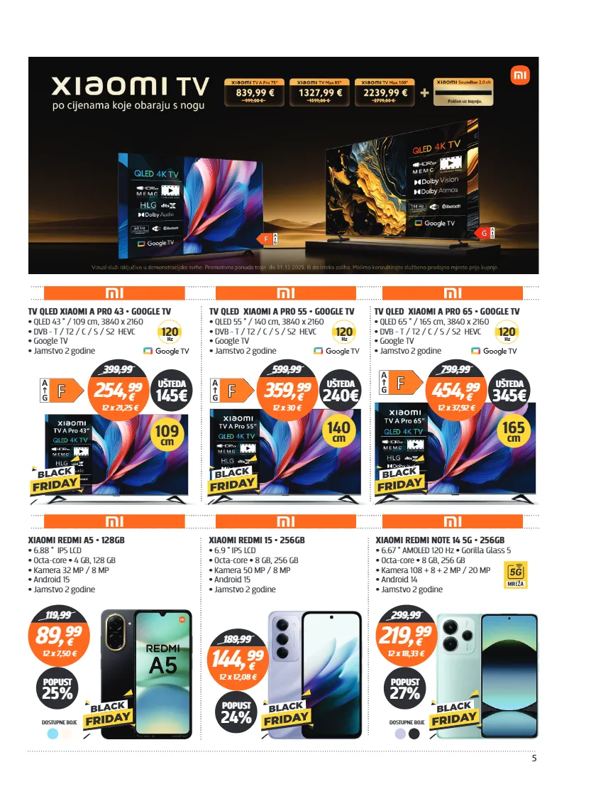 5 tv qled xiaomi a pro 43 • google tv • qled 43 " / 109 cm, 3840 x 2160 dvb - t / t2 / c / s / s2 hevc • google tv • jamstvo 2 godine • 399,99 € 12 x 21,25 € 254,⁹⁹ ušteda 145€ 109 cm 599,99 € 12 x 30 € 359,⁹⁹ ušteda 240€ tv qled xiaomi a pro 55 • google tv • qled 55 " / 140 cm, 3840 x 2160 dvb - t / t2 / c / s / s2 hevc • google tv • jamstvo 2 godine • 120 hz tv qled xiaomi a pro 65 • google tv • qled 65 " / 165 cm, 3840 x 2160 dvb - t / t2 / c / s / s2 hevc • google tv • jamstvo 2 godine • 140 cm 120 hz 799,99 € 12 x 37,92 € 454,⁹⁹ ušteda 345€ 165 cm 120 hz xiaomi redmi a5 • 128gb • 6.88 " ips lcd octa-core 4 gb, 128 gb • • kamera 32 mp / 8 mp • android 15 • jamstvo 2 godine • xiaomi redmi 15 • 256gb • 6.9 " ips lcd octa-core 8 gb, 256 gb • • kamera 50 mp / 8 mp • • android 15 jamstvo 2 godine • xiaomi redmi note 14 5g • 256gb • • 6.67 " amoled 120 hz gorilla glass 5 octa-core 8 gb, 256 gb • • kamera 108 + 8 + 2 mp / 20 mp • • android 14 jamstvo 2 godine • 119,99 € 12 x 7,50 € 89,⁹⁹ popust 25% dostupne boje 189,99 € 12 x 12,08 € 144,⁹⁹ popust 24% 299,99 € 12 x 18,33 € 219,⁹⁹ popust 27% dostupne boje