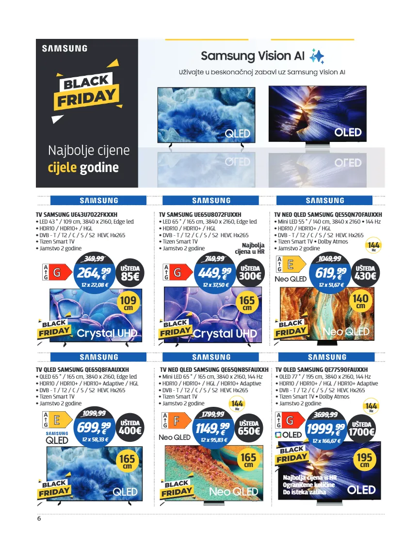 6 tv samsung ue43u7022fkxxh • led 43 " / 109 cm, 3840 x 2160, edge led hdr10 / hdr10+ / hgl • dvb - t / t2 / c / s / s2 hevc hx265 • tizen smart tv • jamstvo 2 godine • 349,99 € 12 x 22,08 € 264,⁹⁹ ušteda 85€ tv samsung ue65u8072fuxxh • led 65 " / 165 cm, 3840 x 2160, edge led hdr10 / hdr10+ / hgl • dvb - t / t2 / c / s / s2 hevc hx265 • tizen smart tv • jamstvo 2 godine • 109 cm najbolja cijena u hr 749,99 € 12 x 37,50 € 449,⁹⁹ ušteda 300€ 165 cm tv neo qled samsung qe55qn70fauxxh • • mini led 55 " / 140 cm, 3840 x 2160 144 hz hdr10 / hdr10+ / hgl • dvb - t / t2 / c / s / s2 hevc hx265 • tizen smart tv dolby atmos • • jamstvo 2 godine • 1049,99 € 12 x 51,67 € 619,⁹⁹ ušteda 430€ 144 hz 140 cm tv qled samsung qe65q8faauxxh • qled 65 " / 165 cm, 3840 x 2160, edge led hdr10 / hdr10+ / hdr10+ adaptive / hgl • dvb - t / t2 / c / s / s2 hevc hx265 • tizen smart tv • jamstvo 2 godine • 1099,99 € 12 x 58,33 € 699,⁹⁹ ušteda 400€ 165 cm tv neo qled samsung qe65qn85fauxxh • mini led 65 " / 165 cm, 3840 x 2160, 144 hz hdr10 / hdr10+ / hgl / hdr10+ adaptive • dvb - t / t2 / c / s / s2 hevc hx265 • tizen smart tv • jamstvo 2 godine • 1799,99 € 12 x 95,83 € 1149,⁹⁹ ušteda 650€ 144 hz 165 cm tv oled samsung qe77s90fauxxh • oled 77 " / 195 cm, 3840 x 2160, 144 hz hdr10 / hdr10+ / hgl / hdr10+ adaptive • dvb - t / t2 / c / s / s2 hevc hx265 • tizen smart tv dolby atmos • • jamstvo 2 godine • 3699,99 € 12 x 166,67 € 1999,⁹⁹ ušteda 1700€ 195 cm najbolja cijena u hr ograničene količine do isteka zaliha 144 hz