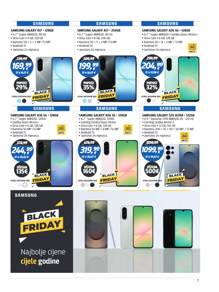 7 SAMSUNG GALAXY A17 • 128GB • 6.7 " Super AMOLED, 90 Hz Octa Core 4 GB, 128 GB • • Kamera 50 + 5 + 2 MP /13 MP • Android 15 • Jamstvo 24 mjeseca • 239,99 169,⁹⁹ € 12 x 14,17 € POPUST 29% OSTALE DOSTUPNE BOJE 309,99 199,⁹⁹ € 12 x 16,67 € POPUST 35% SAMSUNG GALAXY A17 • 256GB • 6.7 " Super AMOLED, 90 Hz Octa Core 8 GB, 256 GB • • Kamera 50 + 5 + 2 MP /13 MP • Android 15 • Jamstvo 24 mjeseca • OSTALE DOSTUPNE BOJE POPUST 32% SAMSUNG GALAXY A26 5G • 128GB • • 6.7 " Super AMOLED Gorilla Glass Victus+ Octa Core 6 GB, 128 GB • • Kamera 50 + 8 + 2 MP / 13 MP • Android 15 • Jamstvo 24 mjeseca • 299,99 204,⁹⁹ € 12 x 17,08 € OSTALE DOSTUPNE BOJE SAMSUNG GALAXY A36 5G • 128GB • 6.7 " Super AMOLED, 120Hz • Gorilla Glass Victus+ Octa Core 6 GB, 128 GB • • Kamera 50 MP /12 MP • Android 15 • Jamstvo 24 mjeseca • 379,99 244,⁹⁹ € 12 x 20,42 € UŠTEDA 135€ OSTALE DOSTUPNE BOJE 479,99 319,⁹⁹ € 12 x 26,67 € UŠTEDA 160€ 1599,99 1099,⁹⁹ € 12 x 91,67 € UŠTEDA 500€ SAMSUNG GALAXY A56 5G • 128GB • 6.7 " Super AMOLED, 120Hz • Corning Gorilla Glass Victus Octa Core 6 GB, 128 GB • • Kamera 50 MP + 8 MP /12 MP • Android 15 • Jamstvo 24 mjeseca • OSTALE DOSTUPNE BOJE OSTALE DOSTUPNE BOJE SAMSUNG GALAXY S25 ULTRA • 512GB • 6.9 " Dynamic LTPO AMOLED 2X • 120 Hz • Corning Gorilla Armor 2 Octa Core 12 GB, 512 GB • • Kamera 200 + 10 + 50 + 50 MP / 12 MP • Android 15 • Jamstvo 24 mjeseca •