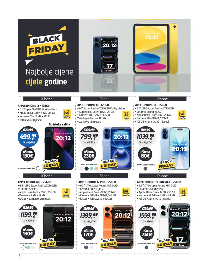 8 APPLE IPHONE 13 • 128GB • 6.1" Super AMOLED, Gorilla Glass Apple Hexa Core 4 GB, 128 GB • • Kamera 12 + 12 MP iOS 15 • • Jamstvo 12 mjeseci • 629,99 € 12 x 41,67 € 499,⁹⁹ Do isteka zaliha UŠTEDA 130€ OSTALE DOSTUPNE BOJE APPLE IPHONE 16 • 128GB • 6.1" Super Retina XDR OLED Dolby Vision Apple Hexa Core 8 GB, 128 GB • • Kamera 48 + 12 MP iOS 18 • • nadogradivo na iOS 26 * Jamstvo 12 mjeseci • 1029,99 799,⁹⁹ € 12 x 66,67 € UŠTEDA 230€ OSTALE DOSTUPNE BOJE 1119,99 1039,⁹⁹ € 12 x 86,67 € UŠTEDA 80€ OSTALE DOSTUPNE BOJE APPLE IPHONE 17 • 256GB • 6.3" LTPO Super Retina XDR OLED • Ceramic Shield glass Apple Hexa Core 8 GB, 256 GB • • Kamera 48 + 18 MP / 12 MP • • • iOS 26 Jamstvo 12 mjeseci 1329,99 1199,⁹⁹ € 12 x 100 € UŠTEDA 130€ OSTALE DOSTUPNE BOJE APPLE IPHONE AIR • 256GB • 6.5 " LTPO Super Retina XDR OLED • Ceramic Shield 2 Apple Hexa Core 12 GB, 256 GB • • Kamera 48 MP / 12 MP • • • iOS 26 Jamstvo 12 mjeseci 1569,99 1399,⁹⁹ € 12 x 116,67 € UŠTEDA 170€ APPLE IPHONE 17 PRO • 256GB • 6.3 " LTPO Super Retina XDR OLED • Ceramic Shield glass Apple Hexa Core 12 GB, 256 GB • • Kamera 48 MP + 48 MP / 48 MP • • • iOS 26 Jamstvo 12 mjeseci OSTALE DOSTUPNE BOJE APPLE IPHONE 17 PRO MAX • 256GB • 6.9 " LTPO Super Retina XDR OLED • Ceramic Shield glass Apple Hexa Core 12 GB, 256 GB • • Kamera 48 MP + 48 MP / 48 MP • • • iOS 26 Jamstvo 12 mjeseci 1799,99 1559,⁹⁹ € 12 x 130 € UŠTEDA 240€ OSTALE DOSTUPNE BOJE