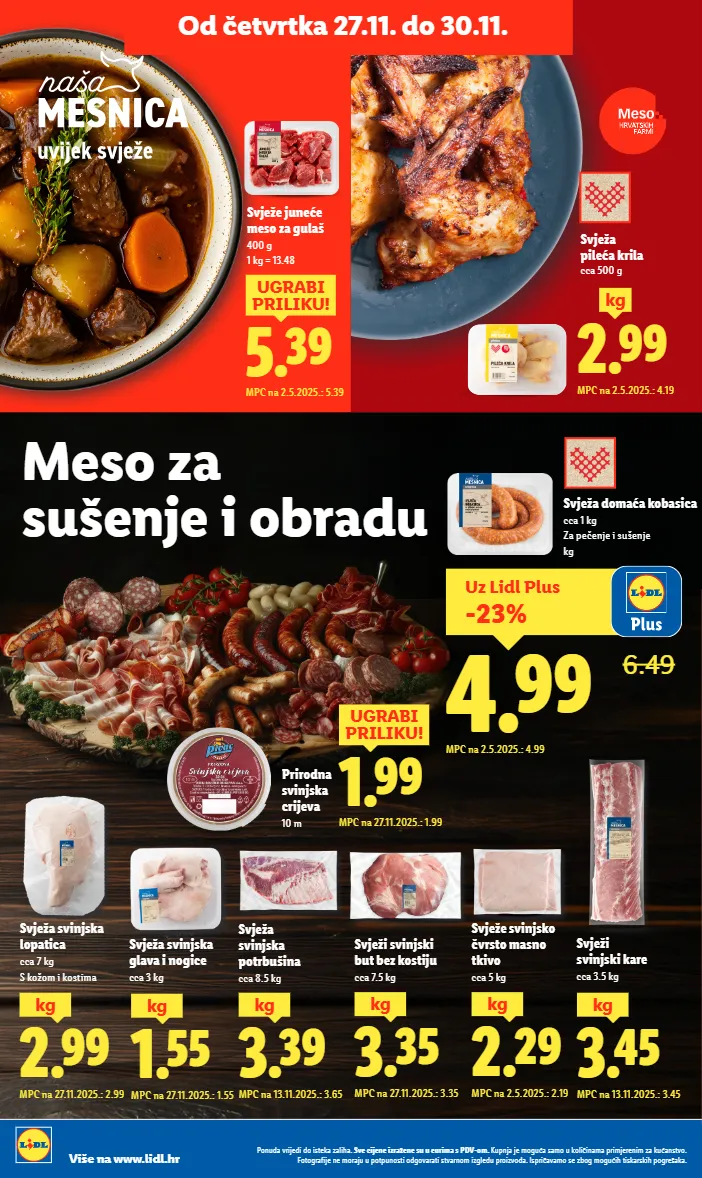 svježe juneće meso za gulaš 400 g 1 kg = 13.48 ponuda vrijedi do isteka zaliha. sve cijene izražene su u eurima s pdv-om. kupnja je moguća samo u količinama primjerenim za kućanstvo. fotografije ne moraju u potpunosti odgovarati stvarnom izgledu proizvoda. ispričavamo se zbog mogućih tiskarskih pogrešaka. više na www.lidl.hr 5.39 ugrabi priliku! mpc na 2.5.2025.: 5.39 2.29 kg mpc na 2.5.2025.: 2.19 3.35 kg mpc na 27.11.2025.: 3.35 3.39 kg mpc na 13.11.2025.: 3.65 2.99 kg mpc na 27.11.2025.: 2.99 2. 99 mpc na 2.5.2025.: 4.19 svježa pileća krila cca 500 g kg svježa domaća kobasica cca 1 kg za pečenje i sušenje kg 3.45 kg mpc na 13.11.2025.: 3.45 1.55 kg mpc na 27.11.2025.: 1.55 uz lidl plus -23% 4.99 6.49 mpc na 2.5.2025.: 4.99 1.99 ugrabi priliku! mpc na 27.11.2025.: 1.99 prirodna svinjska crijeva 10 m meso za sušenje i obradu svježe svinjsko čvrsto masno tkivo cca 5 kg svježi svinjski but bez kostiju cca 7.5 kg svježa svinjska potrbušina cca 8.5 kg svježa svinjska lopatica cca 7 kg s kožom i kostima svježi svinjski kare cca 3.5 kg svježa svinjska glava i nogice cca 3 kg od četvrtka 27.11. do 30.11.