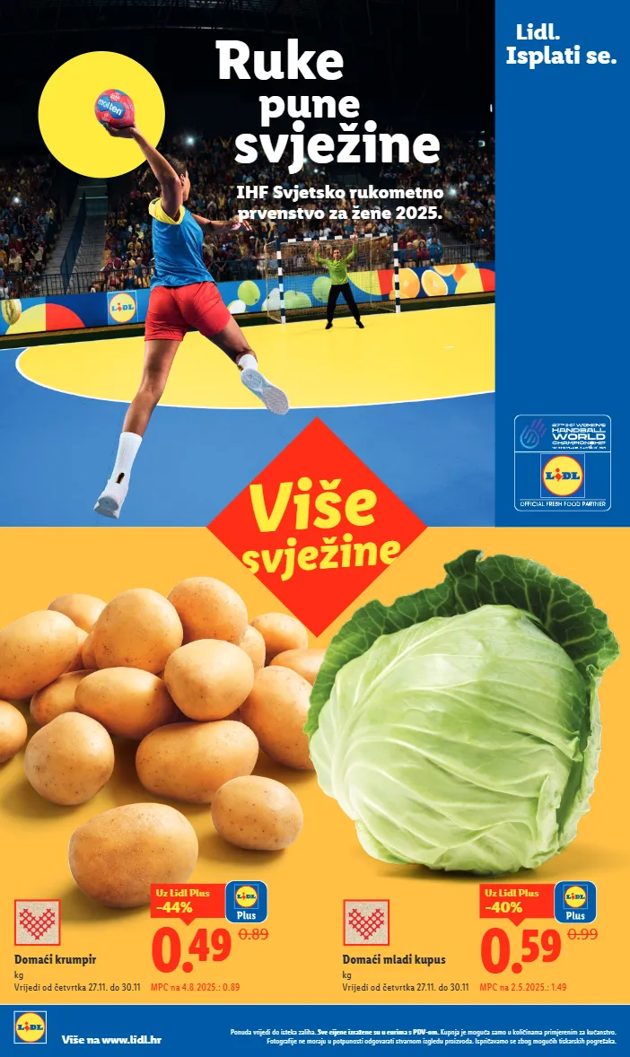 ruke pune svježine ihf svjetsko rukometno prvenstvo za žene 2025. lidl. isplati se. ponuda vrijedi do isteka zaliha. sve cijene izražene su u eurima s pdv-om. kupnja je moguća samo u količinama primjerenim za kućanstvo. fotografije ne moraju u potpunosti odgovarati stvarnom izgledu proizvoda. ispričavamo se zbog mogućih tiskarskih pogrešaka. više na www.lidl.hr mpc na 4.8.2025.: 0.89 0.89 0.49 -44% uz lidl plus domaći krumpir kg vrijedi od četvrtka 27.11. do 30.11 više svježine mpc na 2.5.2025.: 1.49 0.99 0.59 -40% uz lidl plus domaći mladi kupus kg vrijedi od četvrtka 27.11. do 30.11