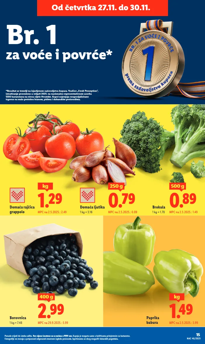borovnica 1 kg = 7.48 2.99 400 g mpc na 29.9.2025.: 5.99 *rezultat se temelji na izjavljenom zadovoljstvu kupaca. yougov „fresh perception”, istraživanje provedeno u veljači 2025. na nacionalno reprezentativnom uzorku 1200 kućanstava na nivou cijele hrvatske. kupci ocjenjuju nespecijalizirane trgovce na malo pretežno hranom, pićima i duhanskim proizvodima. br. 1 za voće i povrće* od četvrtka 27.11. do 30.11. paprika babura 15 nac 48/2025 ponuda vrijedi do isteka zaliha. sve cijene izražene su u eurima s pdv-om. kupnja je moguća samo u količinama primjerenim za kućanstvo. fotografije ne moraju u potpunosti odgovarati stvarnom izgledu proizvoda. ispričavamo se zbog mogućih tiskarskih pogrešaka. 1.49 kg mpc na 2.5.2025.: 3.99 brokula 1 kg = 1.78 0.89 500 g mpc na 2.5.2025.: 1.49 domaća rajčica grappolo 1.29 kg mpc na 2.5.2025.: 2.49 domaća ljutika 1 kg = 3.16 0.79 250 g mpc na 2.5.2025.: 0.89