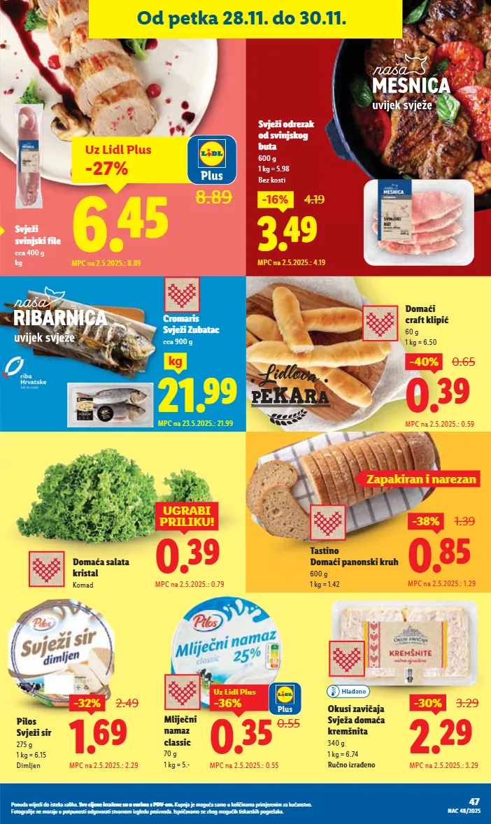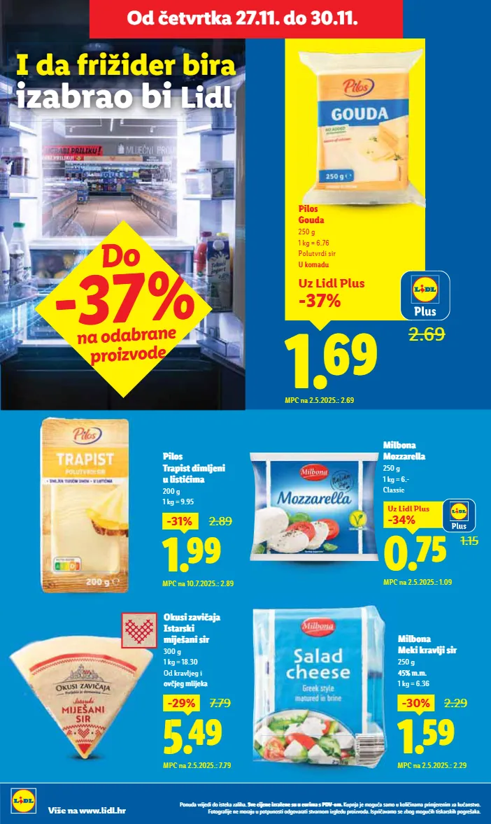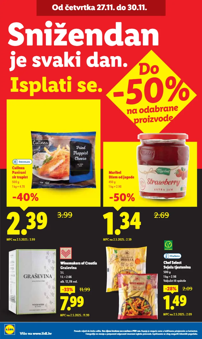 ponuda vrijedi do isteka zaliha. sve cijene izražene su u eurima s pdv-om. kupnja je moguća samo u količinama primjerenim za kućanstvo. fotografije ne moraju u potpunosti odgovarati stvarnom izgledu proizvoda. ispričavamo se zbog mogućih tiskarskih pogrešaka. više na www.lidl.hr 1.19 1.99 milbona maasdamer 150 g 1 kg = 7.93 u listićima mpc na 2.5.2025.: 1.99 -40% 4.49 chef select pureći medaljoni xxl 1.5 kg redovna cijena za 1 kg = 4.49 mpc na 16.5.2025.: 3.99 50% gratis! pilos tekući jogurt 1 kg povratna naknada uključena je u cijenu jagoda-vanilija ili šumsko voće 1.99 1.19 -40% uz lidl plus mpc na 2.5.2025.: 1.89 ili 1.99 je svaki dan. isplati se. snižendan od petka 28.11. do 30.11. chef select lazanje bolognese 800 g 1 kg = 4.74 do -50% na odabrane proizvode 5.49 3.79 -30% uz lidl plus mpc na 2.5.2025.: 5.29