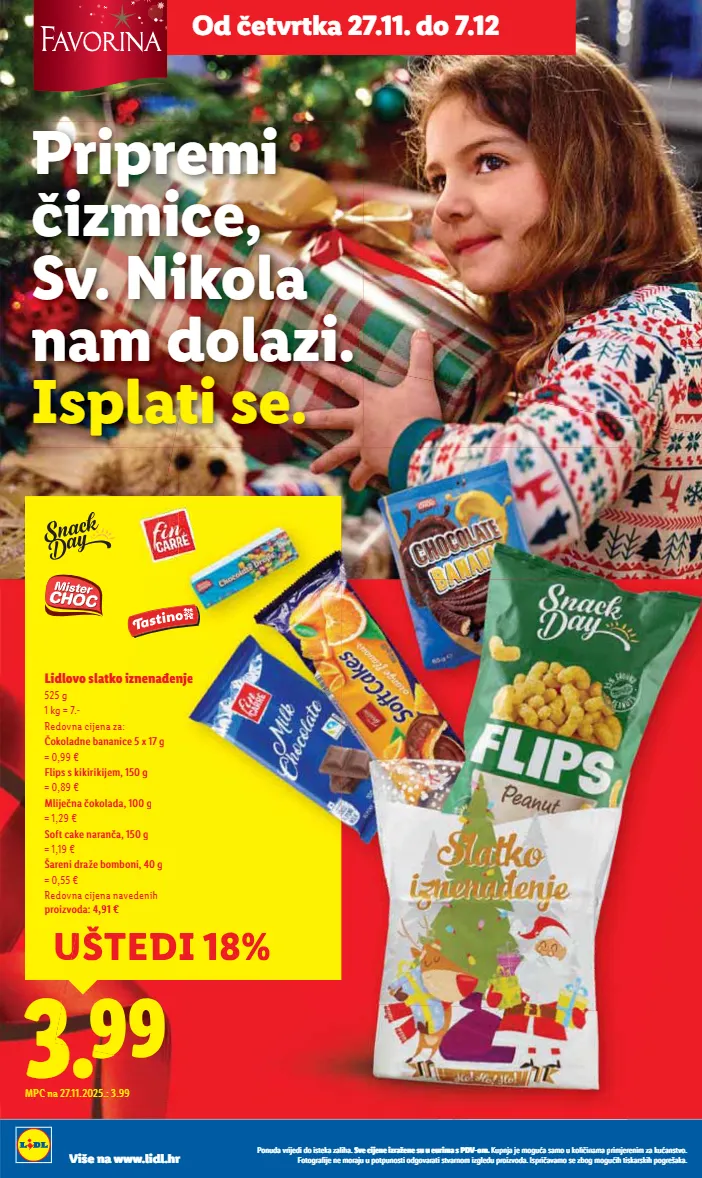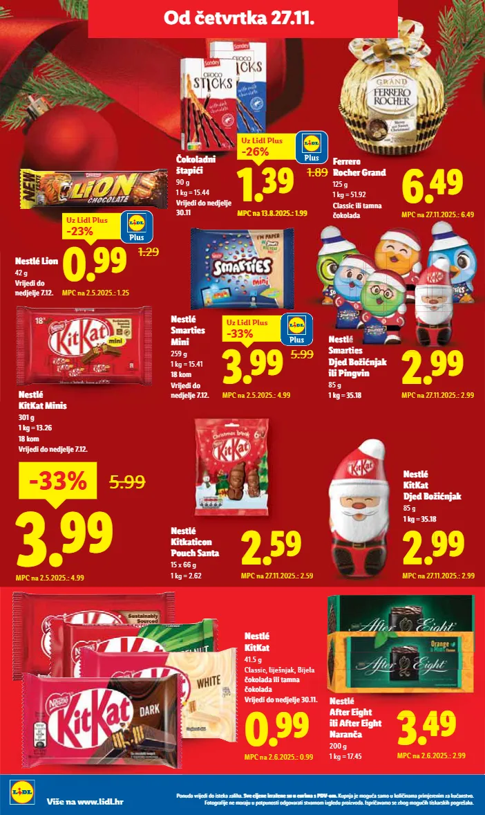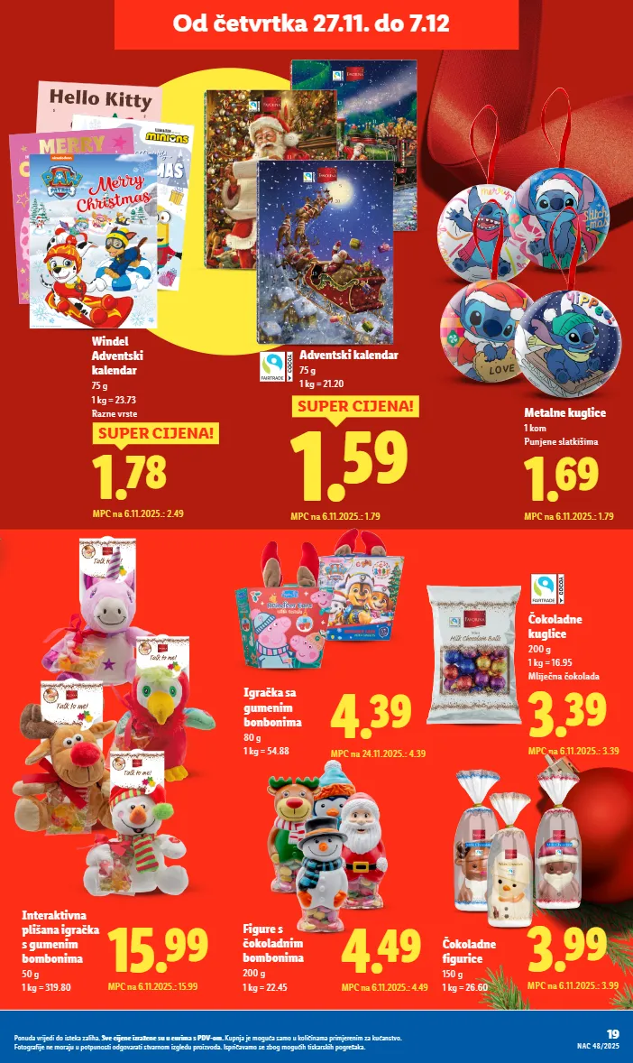 23 Ponuda vrijedi do isteka zaliha. Sve cijene izražene su u eurima s PDV-om. Kupnja je moguća samo u količinama primjerenim za kućanstvo. Fotografije ne moraju u potpunosti odgovarati stvarnom izgledu proizvoda. Ispričavamo se zbog mogućih tiskarskih pogrešaka. NAC 48/2025 Od četvrtka 27.11. Milka Božićna šalica 99 g 1 kg = 63.54 S čokoladicama Milka Djed Božićnjak ili Snjegović 45 g ili 50 g 1 kg = 22.22 ili 25.80 1.29 MPC na 27.11.2025.: 1.29 1.49 MPC na 27.11.2025.: 1.49 - 3.99 već od 3.29 MPC na 27.11.2025.: 3.29 Kinder Djed Božićnjak 75 g 1 kg = 43.87 9.99 MPC na 27.11.2025.: 9.99 Milka Plišana životinja 96 g 1 kg = 104.06 6.29 MPC na 27.11.2025.: 6.29 3.69 MPC na 27.11.2025.: 3.69 Kinder Mini Friends 122 g 1 kg = 30.25 6.99 MPC na 27.11.2025.: 6.99 Ferrero Rocher drvce 150 g 1 kg = 46.60 Surprise Maxi Surprise Kinder Čokolada 12 komada