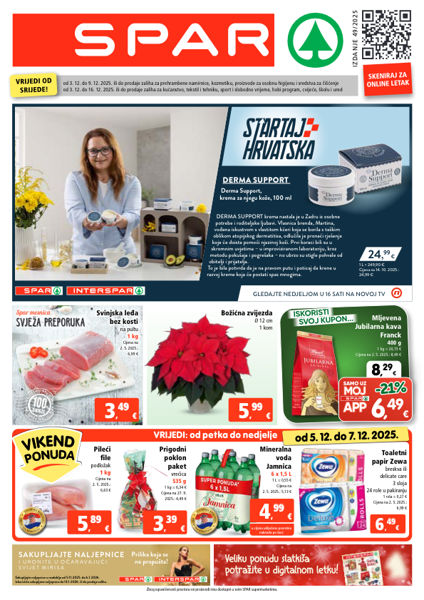 od 5. 12. do 7. 12. 2025. vrijedi: od petka do nedjelje sakupl ja jte nal jepnice i u r o n i t e u o č a r a v a j u ć i s v i j e t m i r i s a prilika koja se ne propušta! sakupljajte naljepnice u razdoblju od 5.11.2025. do 6.1.2026. iskoristite sakupljene naljepnice do 13.1.2026. ili do prodaje zaliha. derma support derma support, krema za njegu kože, 100 ml derma support krema nastala je u zadru iz osobne potrebe i roditeljske ljubavi. vlasnica brenda, martina, vođena iskustvom s vlastitom kćeri koja se borila s teškim oblikom atopijskog dermatitisa, odlučila je pronaći rješenje koje će doista pomoći njezinoj koži. prvi koraci bili su u skromnim uvjetima – u improviziranom laboratoriju, kroz metodu pokušaja i pogrešaka – no ubrzo su stigle pohvale od obitelji i prijatelja. to je bila potvrda da je na pravom putu i poticaj da krene u razvoj kreme koja će postati spas mnogima. 24 , 99 € 1 l = 249,90 € cijena na 14. 10. 2025.: 24,99 € gledajte nedjeljom u 16 sati na novoj tv svje ž a preporuka spar mesnica svinjska leđa bez kosti na pultu 1 kg cijena na 2. 5. 2025.: 6,99 € v i k e n d p o n u d a mineralna voda jamnica 6 x 1,5 l 1 l = 0,55 € cijena na 2. 5. 2025.: 5,13 € pileći file podložak 1 kg cijena na 2. 5. 2025.: 6,63 € prigodni poklon paket vrećica 535 g 1 kg = 6,34 € cijena na 27. 9. 2025.: 4,49 € 6 , 49 49 € € 3 , 49 49 € 5 , 99 99 € 5 , 89 89 € 3 , 39 39 božićna zvijezda ø 12 cm 1 kom iskoristi svoj kupon... 8 , 29 € samo uz 6 , 49 € -21% -21% mljevena jubilarna kava franck 400 g 1 kg = 20,73 € cijena na 2. 5. 2025.: 8,49 € € 4 , 99 99 u cijenu uključena povratna naknada po boci h r v a t s k a k v a l i t e t a h r v a t s k a k v a l i t e t a h r v a t s k a k v a l i t e t a h r v a t s k a k v a l i t e t a toaletni papir zewa breskva ili delicate care 3 sloja 24 role u pakiranju 1 rola = 0,27 € cijena na 2. 5. 2025.: 6,99 € zbog ograničenosti prostora svi proizvodi nisu dostupni u svim spar supermarketima. od 3. 12. do 9. 12. 2025. ili do prodaje zaliha za prehrambene namirnice, kozmetiku, proizvode za osobnu higijenu i sredstva za čišćenje od 3. 12. do 16. 12. 2025. ili do prodaje zaliha za kućanstvo, tekstil i tehniku, sport i slobodno vrijeme, hobi program, cvijeće, školu i ured vrijedi od srijede! i z da n j e 4 9 / 2 025 skeniraj za online letak