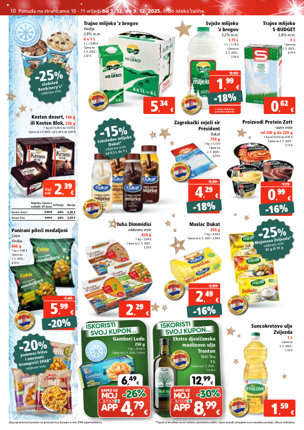 -16% -16% 1,19 € 0 , 99 99 -18% -18% 5,29 € 4 , 29 29 -16% -16% 2,99 € 2 , 49 49 -20% -20% 7,49 € 5 , 99 99 € 1 , 59 59 € 5 , 34 34 € 0 , 62 62 € 2 , 2 29 9 - 25 % sladoled ben&jerry’s* odabrane vrste - 15 % čokoladno mlijeko dukat* odabrane vrste od 0,5 l do 1 l - 25 % majoneza zvijezda* odabrane vrste 85 g ili 95 g - 20 % pommes frites i smrznuti krumpirići spar* odabrane vrste panirani pileći medaljoni cekin vindija 660 g 1 kg = 9,08 € cijena na 2. 5. 2025.: 8,39 € suncokretovo ulje zvijezda 1 l cijena na 2. 5. 2025.: 1,59 € proizvodi protein zott razne vrste od 200 g do 220 g 1 kg od 4,50 € do 4,95 € cijena na 2. 5. 2025.: 1,19 € zagrebački svježi sir président dukat 750 g 1 kg = 5,72 € cijena na 2. 5. 2025.: 5,29 € maslac dukat 250 g 1 kg = 9,96 € cijena na 2. 5. 2025.: 2,99 € juha dimmidisi odabrane vrste 620 g 1 kg = 3,69 € cijena na 2. 5. 2025.: 3,19 € svježe mlijeko ‘z bregov 3,2% m.m. 1,75 l 1 l = 1,14 € cijena na 2. 5. 2025.: 2,45 € trajno mlijeko s-budget 2,8% m.m. 1 l cijena na 2. 5. 2025.: 0,79 € trajno mlijeko ‘z bregov vindija 2,8% m.m. 6 x 1 l 1 l = 0,89 € cijena na 2. 5. 2025.: 2,32 € h r v a t s k a k v a l i t e t a h r v a t s k a k v a l i t e t a h r v a t s k a k v a l i t e t a h r v a t s k a k v a l i t e t a h r v a t s k a k v a l i t e t a h r v a t s k a k v a l i t e t a h r v a t s k a k v a l i t e t a h r v a t s k a k v a l i t e t a h r v a t s k a k v a l i t e t a h r v a t s k a k v a l i t e t a h r v a t s k a k v a l i t e t a h r v a t s k a k v a l i t e t a h r v a t s k a k v a l i t e t a h r v a t s k a k v a l i t e t a iskoristi svoj kupon... iskoristi svoj kupon... 6 , 49 € samo uz 4 , 79 € -26% -26% 12 , 99 € samo uz 8 , 99 € -30% -30% gamberi ledo 250 g 1 kg = 25,96 € cijena na 2. 5. 2025.: 5,99 € ekstra djevičansko maslinovo ulje trenton mali škoj 1 l cijena na 2. 5. 2025.: 13,99 € -18% -18% 2,45 € 1 , 9 99 9 u cijenu uključena povratna naknada h r v a t s k a k v a l i t e t a h r v a t s k a k v a l i t e t a h r v a t s k a k v a l i t e t a h r v a t s k a k v a l i t e t a kesten desert, 140 g ili kesten blok, 250 g 1 kg od 13,40 € do 17,07 € cijena na 2.5.2025.: od 2,49 € do 3,69 € najniža cijena u zadnjih 30 dana jeftinije akcija kesten desert 2,99 € -20% 2,39 € kesten blok 4,19 € -20% 3,35 € već od: € 2 , 39 39 zbog ogranienosti prostora svi proizvodi n i su d o stupni u svim s p a r supermarketima. 10 ponuda na stranicama 10 - 11 vrijedi od 3. 12. do 9. 12. 2025. ili do isteka zaliha. *popust se ne odnosi na već snižene i promotivne artikle. cijene na polici umanjene su za navedeni postotak. slika je simbolična.