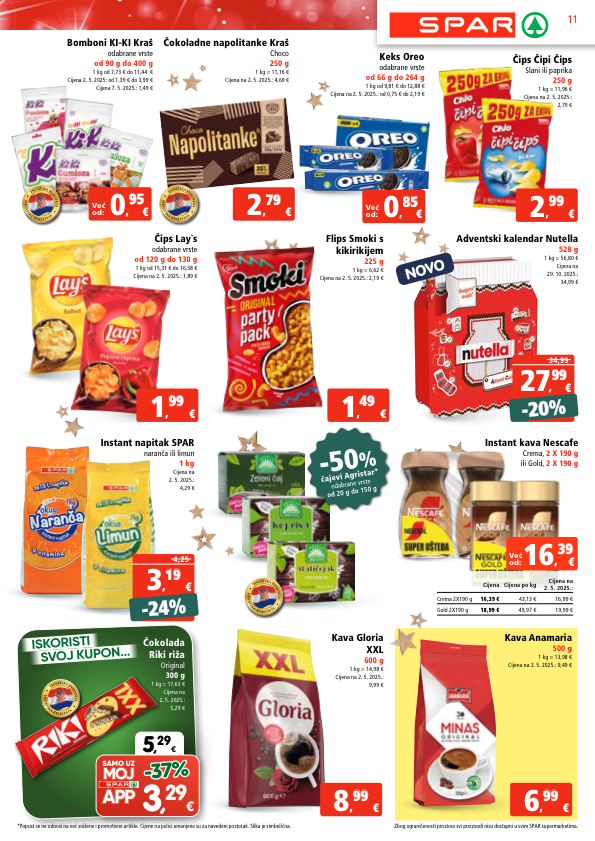 novo -20% -20% 34,99 € 27 , 99 99 - 50 % čajevi agristar* odabrane vrste od 20 g do 150 g kava anamaria 500 g 1 kg = 13,98 € cijena na 2. 5. 2025.: 9,49 € čips čipi čips slani ili paprika 250 g 1 kg = 11,96 € cijena na 2. 5. 2025.: 2,79 € kava gloria xxl 600 g 1 kg = 14,98 € cijena na 2. 5. 2025.: 9,99 € flips smoki s kikirikijem 225 g 1 kg = 6,62 € cijena na 2. 5. 2025.: 2,19 € čips lay`s odabrane vrste od 120 g do 130 g 1 kg od 15,31 € do 16,58 € cijena na 2. 5. 2025.: 1,89 € čokoladne napolitanke kraš choco 250 g 1 kg = 11,16 € cijena na 2. 5. 2025.: 4,69 € instant napitak spar naranča ili limun 1 kg cijena na 2. 5. 2025.: 4,29 € h r v a t s k a k v a l i t e t a h r v a t s k a k v a l i t e t a h r v a t s k a k v a l i t e t a h r v a t s k a k v a l i t e t a h r v a t s k a k v a l i t e t a h r v a t s k a k v a l i t e t a h r v a t s k a k v a l i t e t a h r v a t s k a k v a l i t e t a -24% -24% 4,25 € 3 , 19 19 € 8 , 99 99 € 2 , 79 79 € 2 , 99 99 € 1 , 49 49 € 1 , 99 99 € 6 , 99 99 već od: € 0 , 85 85 već od: € 0 , 95 95 iskoristi svoj kupon... 5 , 29 € samo uz 3 , 29 € -37% -37% čokolada riki riža original 300 g 1 kg = 17,63 € cijena na 2. 5. 2025.: 5,29 € instant kava nescafe crema, 2 x 190 g ili gold, 2 x 190 g cijena cijena po kg cijena na 2. 5. 2025.: crema 2x190 g 16,39 € 43,13 € 16,99 € gold 2x190 g 18,99 € 49,97 € 19,99 € već od: € 16 , 39 39 bomboni ki-ki kraš odabrane vrste od 90 g do 400 g 1 kg od 7,73 € do 11,44 € cijena 2. 5. 2025: od 1,39 € do 3,99 € cijena 7. 5. 2025.: 1,49 € keks oreo odabrane vrste od 66 g do 264 g 1 kg od 9,81 € do 12,88 € cijena na 2. 5. 2025.: od 0,75 € do 2,19 € adventski kalendar nutella 528 g 1 kg = 56,80 € cijena na 29. 10. 2025.: 34,99 € 11 *popust se ne odnosi na već snižene i promotivne artikle. cijene na polici umanjene su za navedeni postotak. slika je simbolična. zbog ograničenosti prostora svi proizvodi nisu dostupni u svim spar supermarketima.
