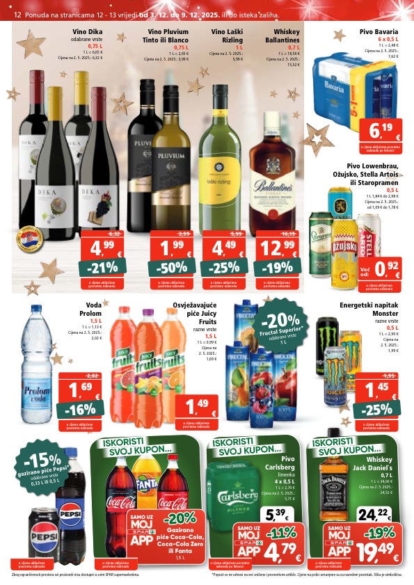 - 20 % fructal superior* odabrane vrste 1 l - 15 % gazirano piće pepsi* odabrane vrste 0,33 l ili 0,5 l pivo bavaria 6 x 0,5 l 1 l = 2,48 € cijena na 2. 5. 2025.: 7,62 € pivo lowenbrau, ožujsko, stella artois ili staropramen 0,5 l 1 l 1,84 € do 2,98 € cijena na 2. 5. 2025.: od 1,09 € do 1,78 € energetski napitak monster razne vrste 0,5 l 1 l = 2,90 € cijena na 2. 5. 2025.: 1,99 € vino pluvium tinto ili blanco 0,75 l 1 l = 2,65 € cijena na 2. 5. 2025.: 3,99 € osvježavajuće piće juicy fruits razne vrste 1,5 l 1 l = 0,99 € cijena na 2. 5. 2025.: 1,69 € whiskey ballantines 0,7 l 1 l = 18,56 € cijena na 2. 5. 2025.: 15,52 € vino laški rizling 1 l cijena na 2. 5. 2025.: 5,99 € vino dika odabrane vrste 0,75 l 1 l = 6,65 € cijena na 2. 5. 2025.: 6,32 € voda prolom 1,5 l 1 l = 1,13 € cijena na 2. 5. 2025.: 2,02 € h r v a t s k a k v a l i t e t a h r v a t s k a k v a l i t e t a iskoristi svoj kupon... iskoristi svoj kupon... iskoristi svoj kupon... 24 , 22 € samo uz 19 , 49 € -19% -19% 5 , 39 € samo uz 4 , 79 € -11% -11% whiskey jack daniel`s 0,7 l 1 l = 34,60 € cijena na 2. 5. 2025.: 24,52 € pivo carlsberg limenka 4 x 0,5 l 1 l = 2,70 € cijena na 2. 5. 2025.: 5,71 € € 6 , 19 19 u cijenu uključena povratna naknada po limenci € 1 , 49 49 u cijenu uključena povratna naknada u cijenu uključena povratna naknada u cijenu uključena povratna naknada po limenci -16% -16% 2,02 € 1 , 69 69 u cijenu uključena povratna naknada -25% -25% 1,95 € 1 , 4 45 5 u cijenu uključena povratna naknada -19% -19% 16,19 € 12 , 9 99 9 u cijenu uključena povratna naknada -25% -25% 5,99 € 4 , 49 49 u cijenu uključena povratna naknada -50% -50% 3,99 € 1 , 9 99 9 u cijenu uključena povratna naknada -21% -21% 6,32 € 4 , 9 99 9 u cijenu uključena povratna naknada u cijenu uključena povratna naknada u cijenu uključena povratna naknada već od: € 0 , 92 92 samo uz -20% -20% gazirano piće coca-cola, coca-cola zero ili fanta 1,5 l u cijenu uključena povratna naknada zbog ograničenosti prostora svi proizvodi nisu dostupni u svim spar supermarketima. ponuda na stranicama 12 - 13 vrijedi od 3. 12. do 9. 12. 2025. ili do isteka zaliha. 12 *popust se ne odnosi na već snižene i promotivne artikle. cijene na polici umanjene su za navedeni postotak. slika je simbolična.