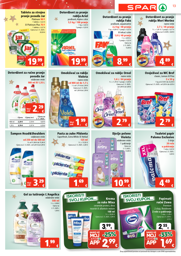 deterdžent za pranje rublja meri merino razne vrste 2,7 l / 45 pranja 1 l = 1,81 € / 1 pranje = 0,11 € cijena na 2.5.2025.: 4,64 € deterdžent za pranje rublja faks praškasti, aquamarine 2,2 kg / 40 pranja 1 kg = 4,09 € / 1 pranje = 0,22 € ili tekuci color 1,8 l/ 40 pranja 1 l = 4,99 € / 1 pranje = 0,22 € cijena na 2. 5. 2025.: 13,49 € deterdžent za pranje rublja ariel praškasti, alpine color 5,5 kg / 100 pranja 1 kg = 3,63 € 1 pranje = 0,20 € h r v a t s k a k v a l i t e t a h r v a t s k a k v a l i t e t a h r v a t s k a k v a l i t e t a h r v a t s k a k v a l i t e t a € 1 , 99 99 € 8 , 99 99 € 19 , 99 99 € 4 , 89 89 iskoristi svoj kupon... iskoristi svoj kupon... 2 , 55 € samo uz 1 , 69 € -33% -33% 3 , 99 € samo uz 2 , 99 € -25% -25% papirnati ručni zewa premium 2 sloja, flexisheets 2 role u pakiranju 1 rola = 1,28 € cijena na 2. 5. 2025.: 2,55 € krema za ruke mixa ceramide protect, shea nourish ili allantoin restore 100 ml 1 l = 39,90 € cijena na 2. 5. 2025.: 3,99 € deterdžent za ručno pranje posuđa jar odabrane vrste 900 ml ili 1,35 l cijena cijena na l cijena na 2. 5. 2025.: 900 ml 2,29 € 2,54 € 4,69 € 1,35 l 2,79 € 2,07 € 6,59 € već od: € 2 , 29 29 tablete za strojno pranje posuđa jar platinum 90/1 1 tableta = 0,22 € ili platinum plus 75/1 1 tableta = 0,27 € cijena na 2. 5. 2025.: 29,99 € € 19 , 9 99 9 omekšivač za rublje ornel razne vrste 1,6 l / 64 pranja 1 l = 1,74 € / 1 pranje = 0,04 € cijena na 2. 5. 2025.: od 3,99 € do 4,99 € omekšivač za rublje violeta razne vrste od 800 ml do 1,7 l 1 l od 1,75 € do 2,49 € cijena na 2. 5. 2025.: od 1,99 € do 2,99 € € 2 , 7 79 9 € 1 , 6 69 9 h r v a t s k a k v a l i t e t a h r v a t s k a k v a l i t e t a € 2 , 79 79 osvježivač za wc bref classic, lemon ili pine 2 x 50 g 1 kg od 27,90 € do 32,90 € cijena na 2. 5. 2025.: od 3,95 € do 4,95 € šampon head&shoulders odabrane vrste od 250 ml do 500 ml 1l od 11,98 € do 15,96 € cijena na 2. 5. 2025.: od 4,29 € do 6,99 € pasta za zube plidenta superfresh, extra white ili herbal 125 ml 1 l = 13,52 € cijena na 2. 5. 2025.: 2,69 € već od: € 3 , 29 29 već od: € 1 , 99 99 gel za tuširanje l´angelica odabrane vrste 500 ml 1 l = 3,98 € cijena na 2. 5. 2025.: 1,99 € toaletni papir paloma exclusive 3 sloja 20 rola u pakiranju 1 rola = 0,22 € cijena na 2. 5. 2025.: 4,49 € € 4 , 49 49 dječje pelene violeta odabrane vrste 1 pakiranje cijena na 2. 5. 2025.: 13,99 € € 10 , 99 99 13 zbog ograničenosti prostora svi proizvodi nisu dostupni u svim spar supermarketima.