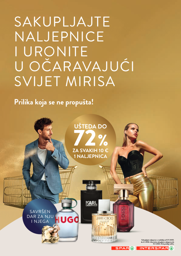UŠTEDA DO ZA SVAKIH 10 € 1 NALJEPNICA SAVRŠEN DAR ZA NJU I NJEGA Sakupljajte naljepnice u razdoblju od 5.11.2025. do 6.1.2026. Iskoristite sakupljene naljepnice do 13.1.2026. ili do prodaje zaliha. SAKUPL JA JTE NAL JEPNICE I URONITE U O ČARAVA JUĆI SVIJET MIRISA Prilika koja se ne propušta!