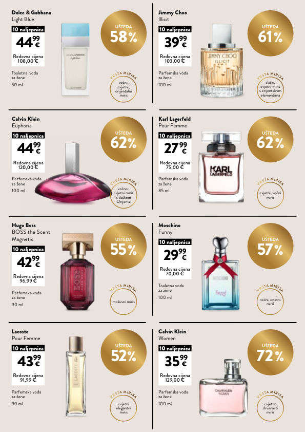 UŠTEDA 58 % UŠTEDA 62 % UŠTEDA 55 % UŠTEDA 52 % UŠTEDA 61 % UŠTEDA 62 % UŠTEDA 57 % UŠTEDA 72 % Toaletna voda za žene 50 ml Dolce & Gabbana Light Blue 44 99 10 naljepnica Redovna cijena 108,00 € € Parfemska voda za žene 100 ml Jimmy Choo Illicit 39 99 10 naljepnica Redovna cijena 103,00 € € Parfemska voda za žene 85 ml Karl Lagerfeld Pour Femme 27 99 10 naljepnica Redovna cijena 75,00 € € Parfemska voda za žene 100 ml Calvin Klein Euphoria 44 99 10 naljepnica Redovna cijena 120,00 € € V R S T A M I R I S A mošusni miris Parfemska voda za žene 30 ml Hugo Boss BOSS the Scent Magnetic 42 99 10 naljepnica Redovna cijena 96,99 € € V R S T A M I R I S A voćni, cvjetni miris Toaletna voda za žene 100 ml Moschino Funny 29 99 10 naljepnica Redovna cijena 70,00 € € V R S T A M I R I S A cvjetni elegantni miris Parfemska voda za žene 90 ml Lacoste Pour Femme 43 99 10 naljepnica Redovna cijena 91,99 € € V R S T A M I R I S A cvjetno drvenasti miris Parfemska voda za žene 100 ml Calvin Klein Women 35 99 10 naljepnica Redovna cijena 129,00 € € V R S T A M I R I S A voćni, cvjetni, orijentalni miris V R S T A M I R I S A slatki, cvjetni miris s orijentalnim elementima V R S T A M I R I S A cvjetni, voćni miris V R S T A M I R I S A voćno- cvjetni miris s daškom Orijenta